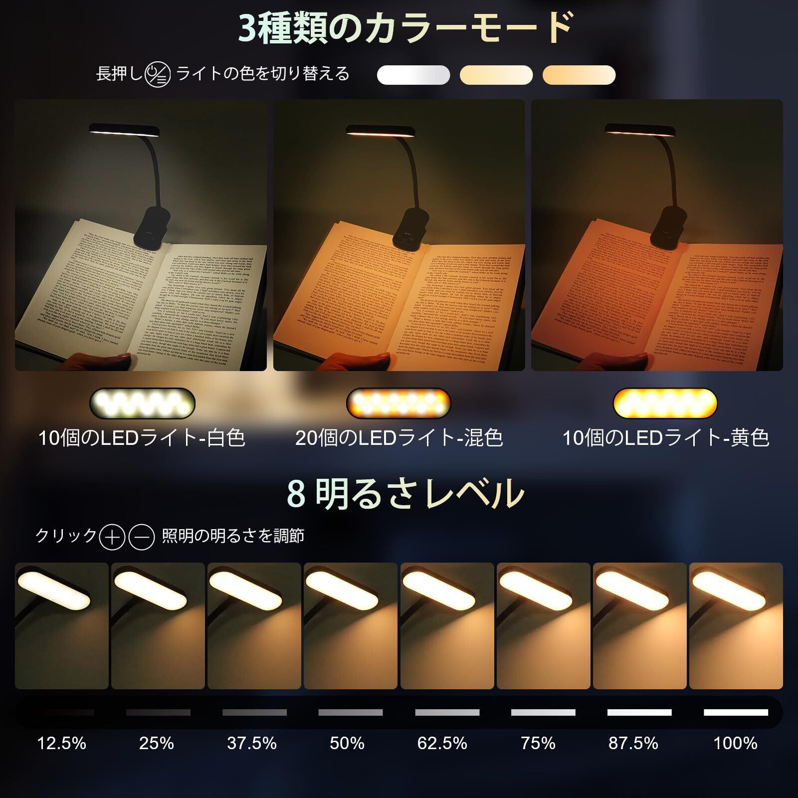 【無段階調光24モード】:3色温度+8段階の明るさ、計24モードを自由に調節可能。無段階調光に対応し、読書に最適な光色と明るさを見つけられます!本製品はメモリー機能を搭載し、前回使用した照明モードと明るさ設定を自動保存。次回起動時に再調整不要で、すぐに慣れた快適な光に戻ります。