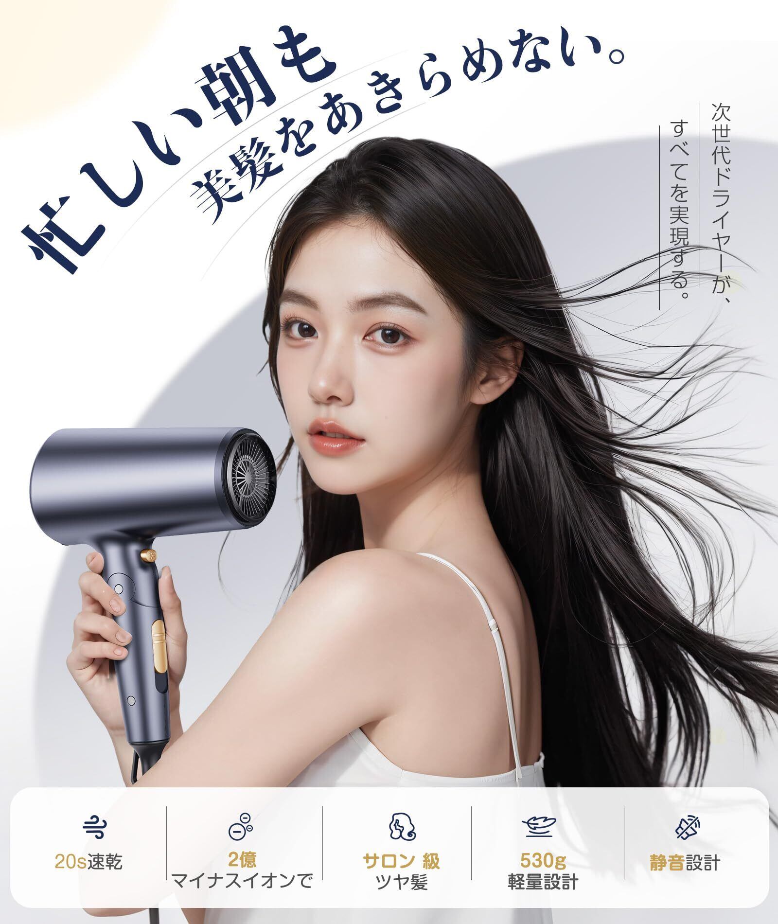 ドライヤー 大風量 2億高濃度マイナスイオン 静電気抑制 髪質改善 3段階風温調節&4段階風量(温冷リズム)過熱保護 折り畳み式 防塵フィルター 超軽量 静音 ノズル付き 家庭用/出張用/旅行用/プレゼントに最適 PSE認証済み