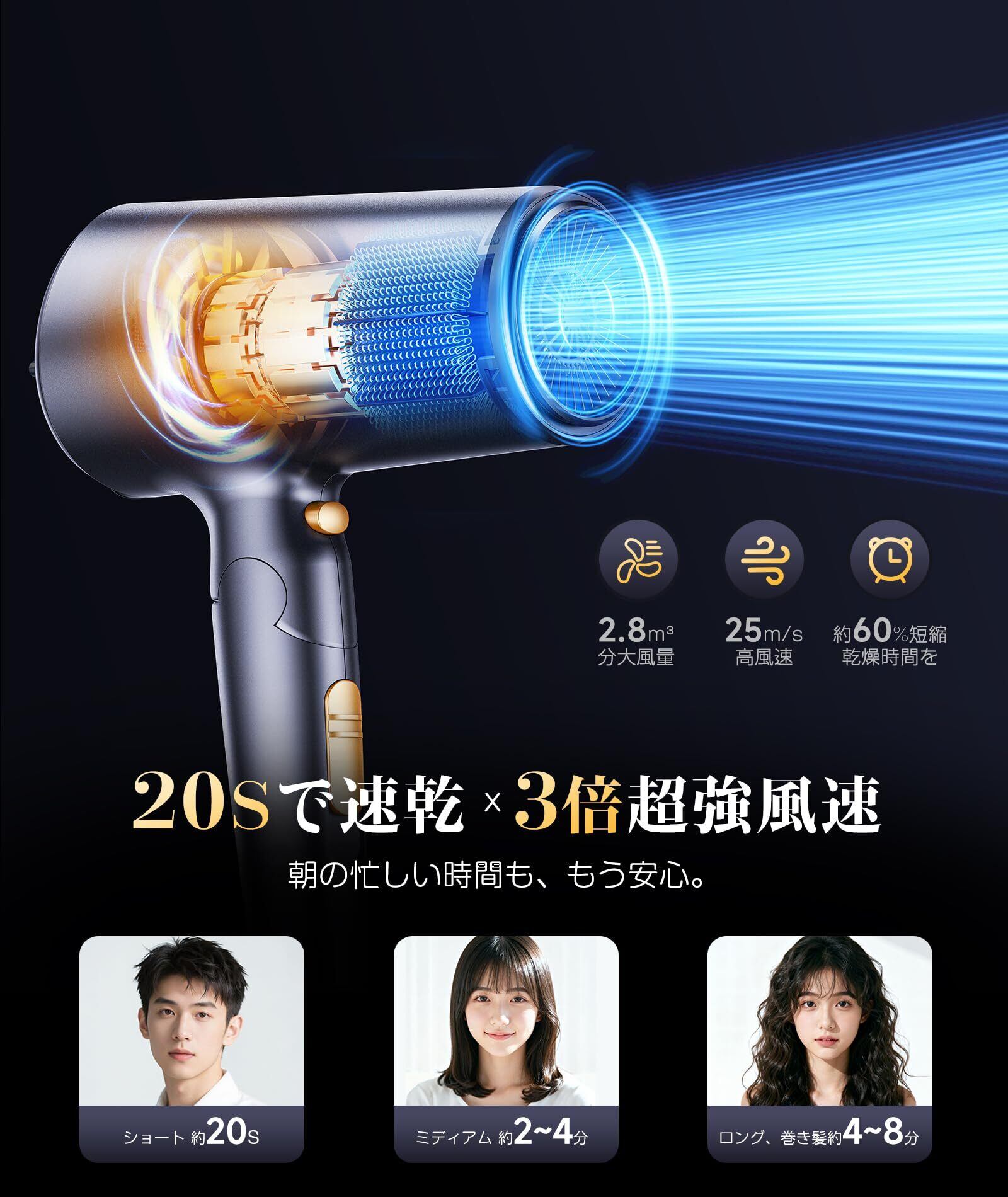 【20秒速乾&温度ケアで、待ち時間を短縮】EnergyBearヘアドライヤーは、強力なのブラシレスモーターを搭載。従来のドライヤーを上回る暴風級の強風と、最適化された気流設計で、髪を素早くやさしく乾かします。ショートヘアは約1分、ロングヘアでも5分以内のスタイリングを実現。忙しい朝も時短で仕上げて、大切な家族との時間をより豊かに。