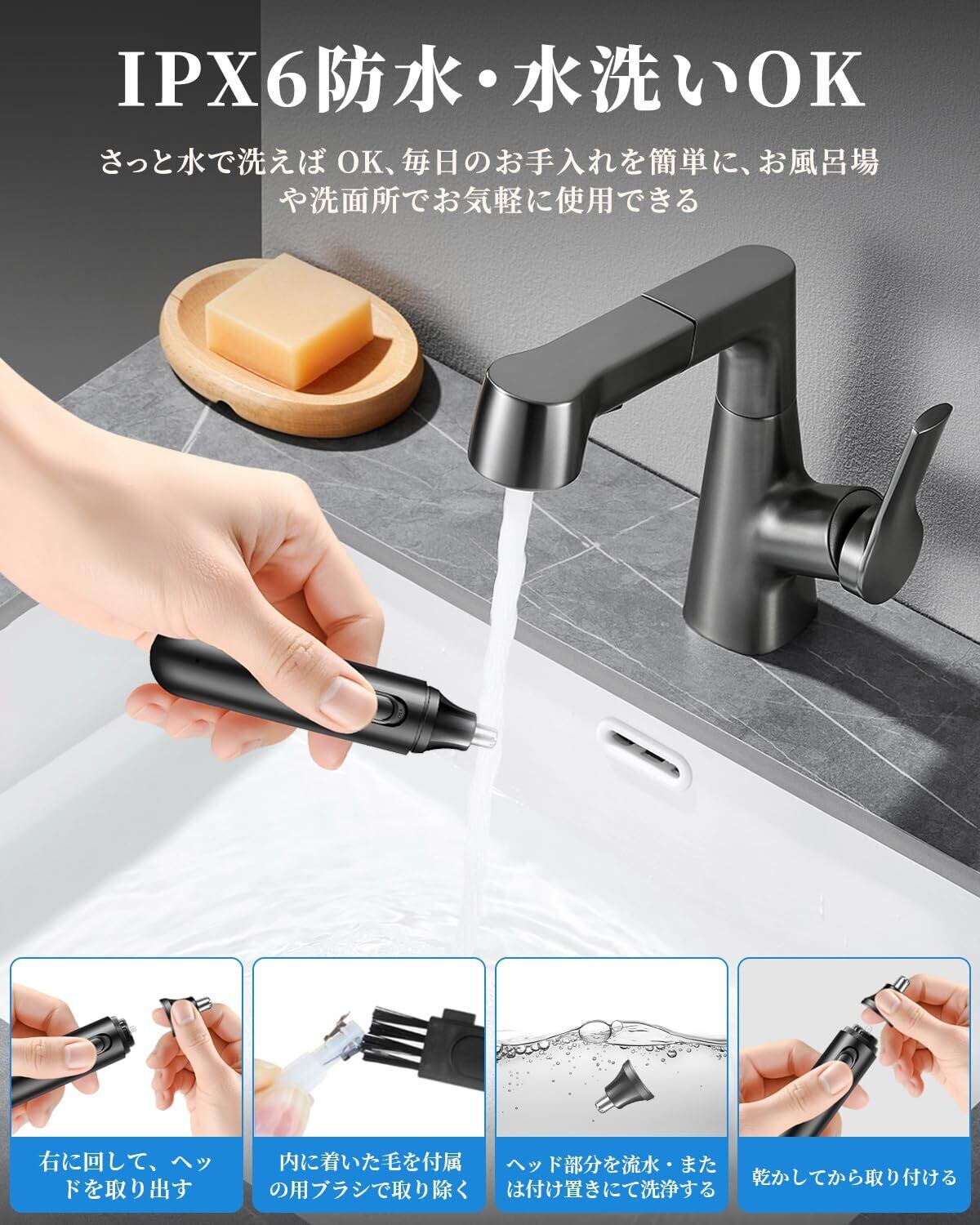 【IPX6防水&お手入れが簡単】電動鼻毛剃りは防水できます。鼻毛切りの先端は、外して直接にすすぐことができ、残留物や細菌の繁殖を防ぎ、いつでも清潔に保つことができます。鼻毛カッター 充電式はヘッドを取り外して洗うこともできます。 ユニークな双頭清掃ブラシは、鼻毛カッター usb充電式を簡単にお手入れができながら、鼻毛カッターの清潔を保つことができます。