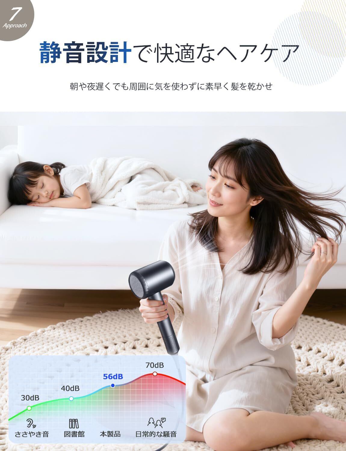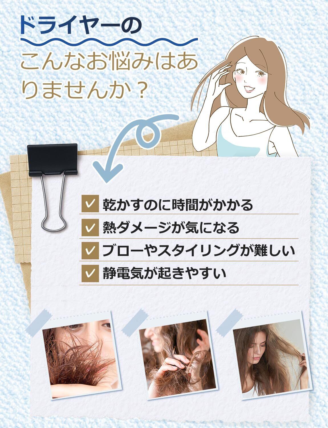 【3段階風量調整&冷風機能・髪質に合わせた自由なスタイリング】本製品は、1台で幅広い髪質やスタイリングに対応できるよう、3段階の風量と温度設定を搭載しています。1段階は「柔風・熱風」で、髪をやさしく乾かしながら、ダメージを抑えたい時に最適です。2段階は「強風・暖風」で、普段使いに適した温度と風量を実現し、短時間で均一に乾燥できます。そして3段階は「強風・熱風」で、濡れた髪を一気に乾かしたい時や、忙しい朝に最適です。さらに、冷風機能を備えているため、仕上げに冷風を当てることで髪のキューティクルを引き締め、ツヤ感とまとまりのある美しい仕上がりを実現します。温風で素早く乾燥させた後に冷風で仕上げることで、髪の形を固定し、スタイルを長持ちさせることができます。日常のケアから特別な日のスタイリングまで、幅広いシーンで活躍するドライヤーです。
