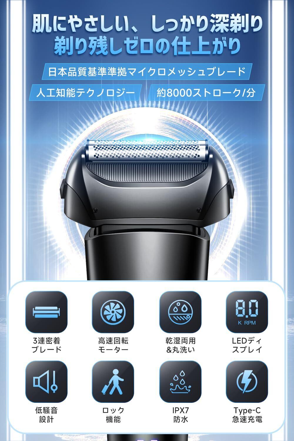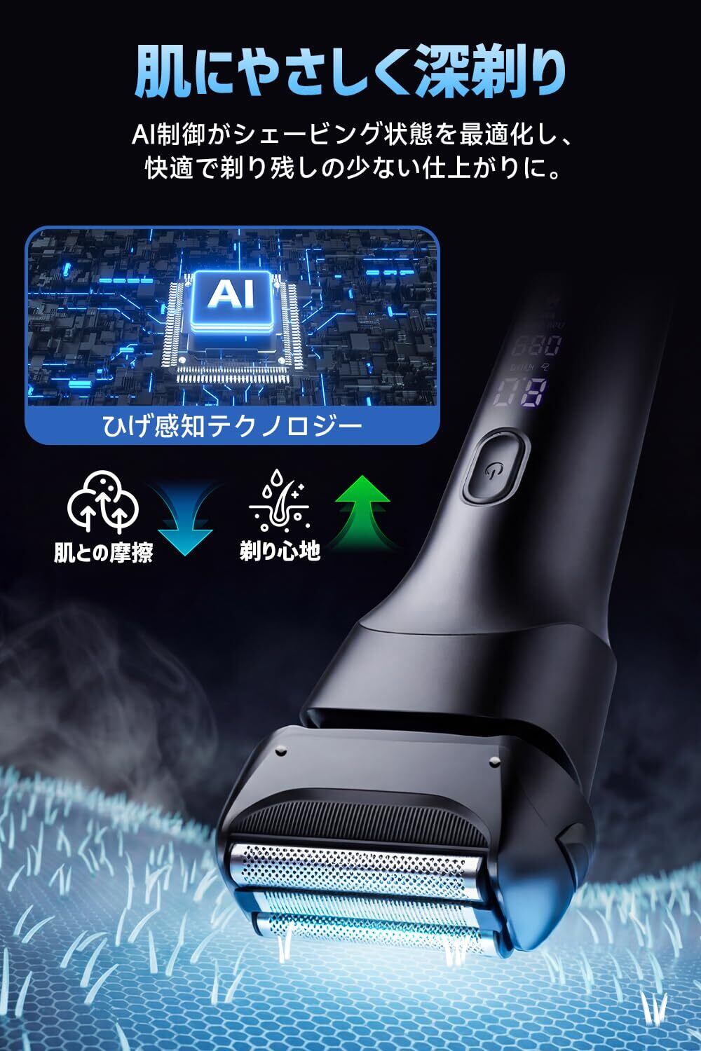 【3連密着ブレードでしっかり深剃り】2026年新登場の ひげそり 電動シェーバー は、 3連 密着ブレード 構造を採用。顔の凹凸やフェイスラインに自然にフィットし、 往復式 の カット 方式でヒゲを効率よくキャッチします。 深剃り 性能に優れながらも、刃が直接肌に触れにくい設計のため、 敏感肌 の方にも やさしい 剃り 心地を実現。毎日の 髭剃り 電動 として、剃り残しを減らしながら快適に使える シェーバー メンズ です。
