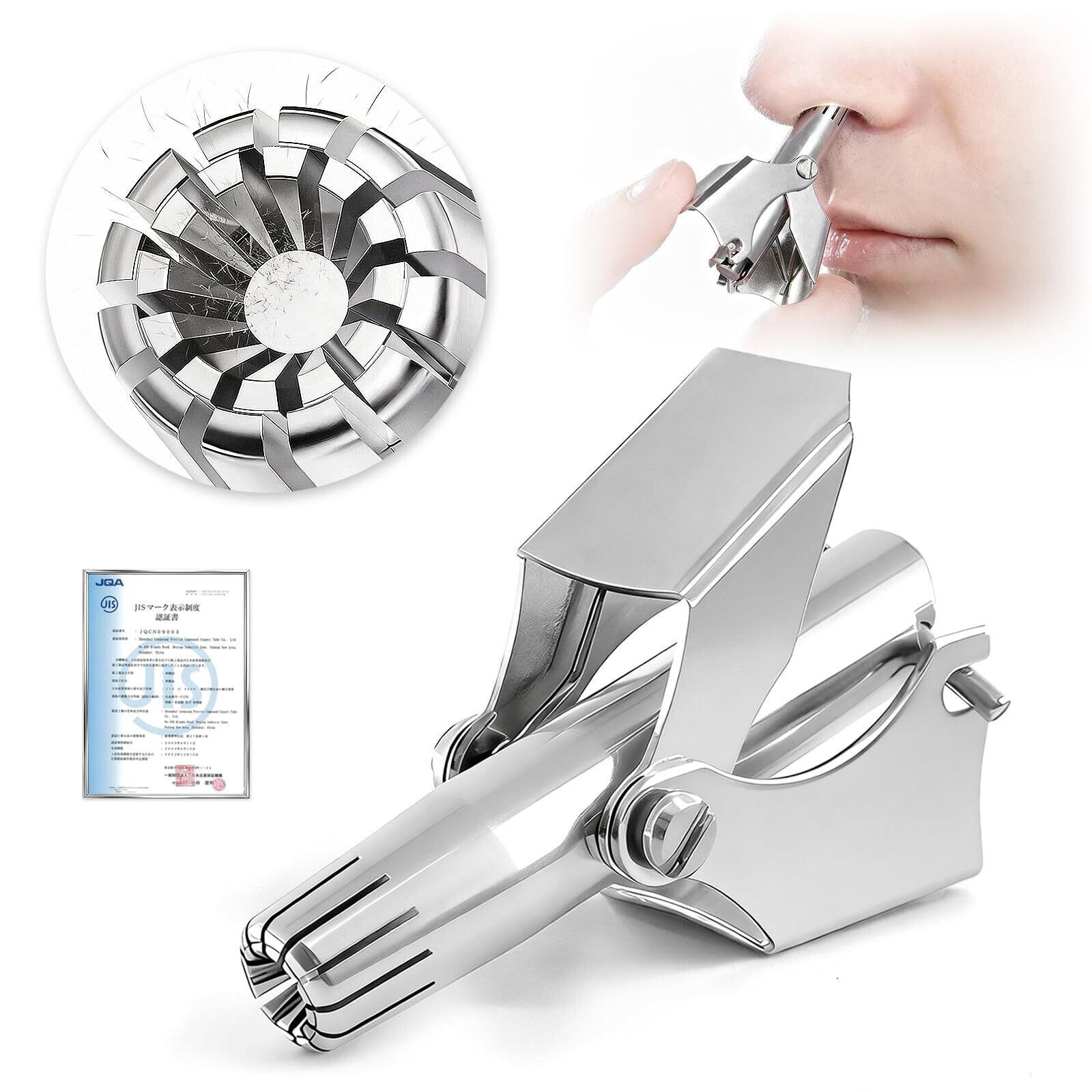 【JIS 認証高密度設計:0.1mm極薄刃で精密処理】JIS認証を受けた高密度設計の鼻毛カッター。0.1mm極薄刃が、はなげカッターとして精密な鼻毛切りを実現。手動操作でもガタつかず、メンズの太い毛にもレディースの細い毛にもしっかり対応する優れたエチケットカッターです。