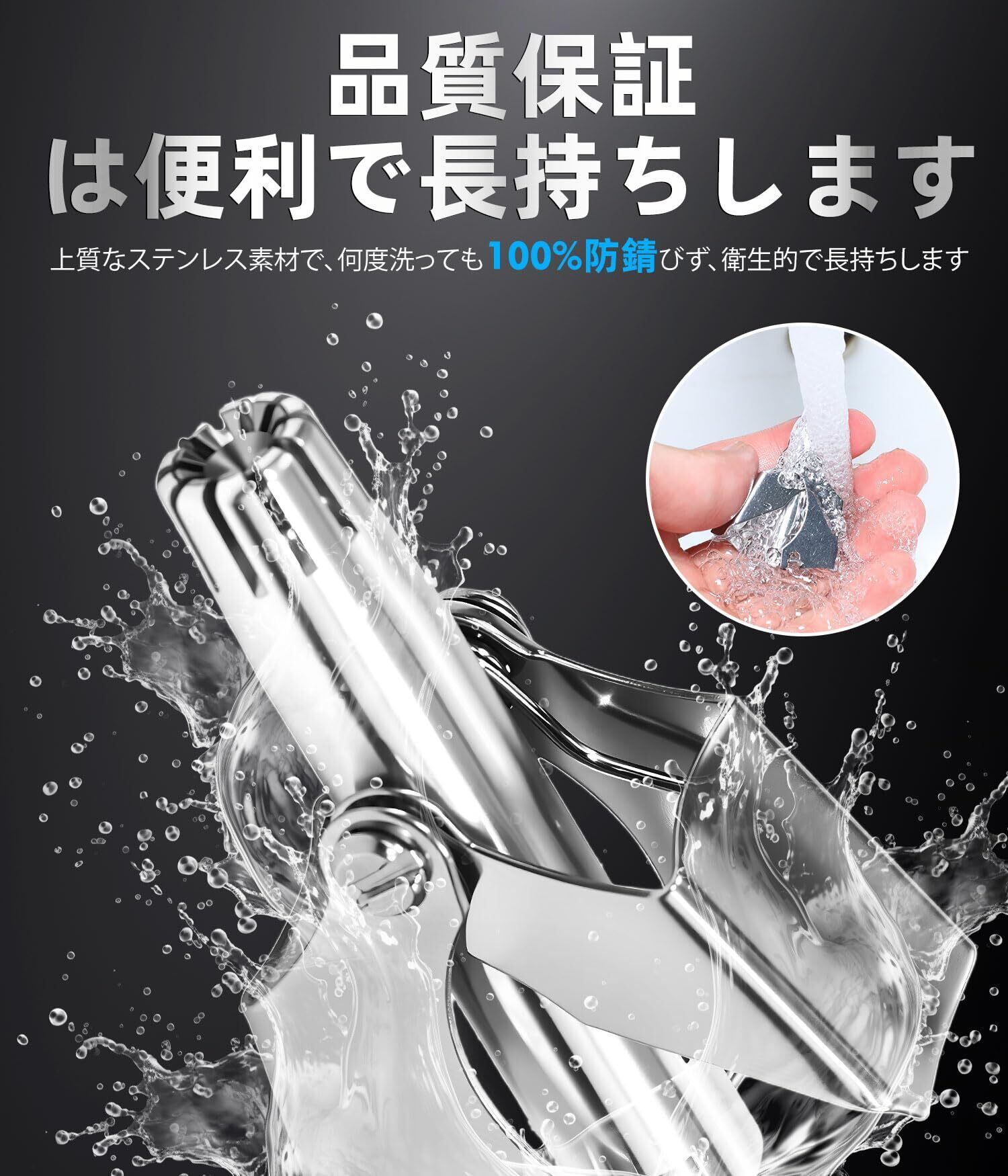 【防錆機能&全身水洗:メンテナンスが超簡単】防錆処理を施したこの手動鼻毛カッターは、全身水洗い可能。はな毛カッターとして使用後はさっと洗え、メンズ・レディースのどちらにもストレスフリーな鼻毛切りを提供。エチケットカッターとして、日々の手入れが驚くほど簡単です。