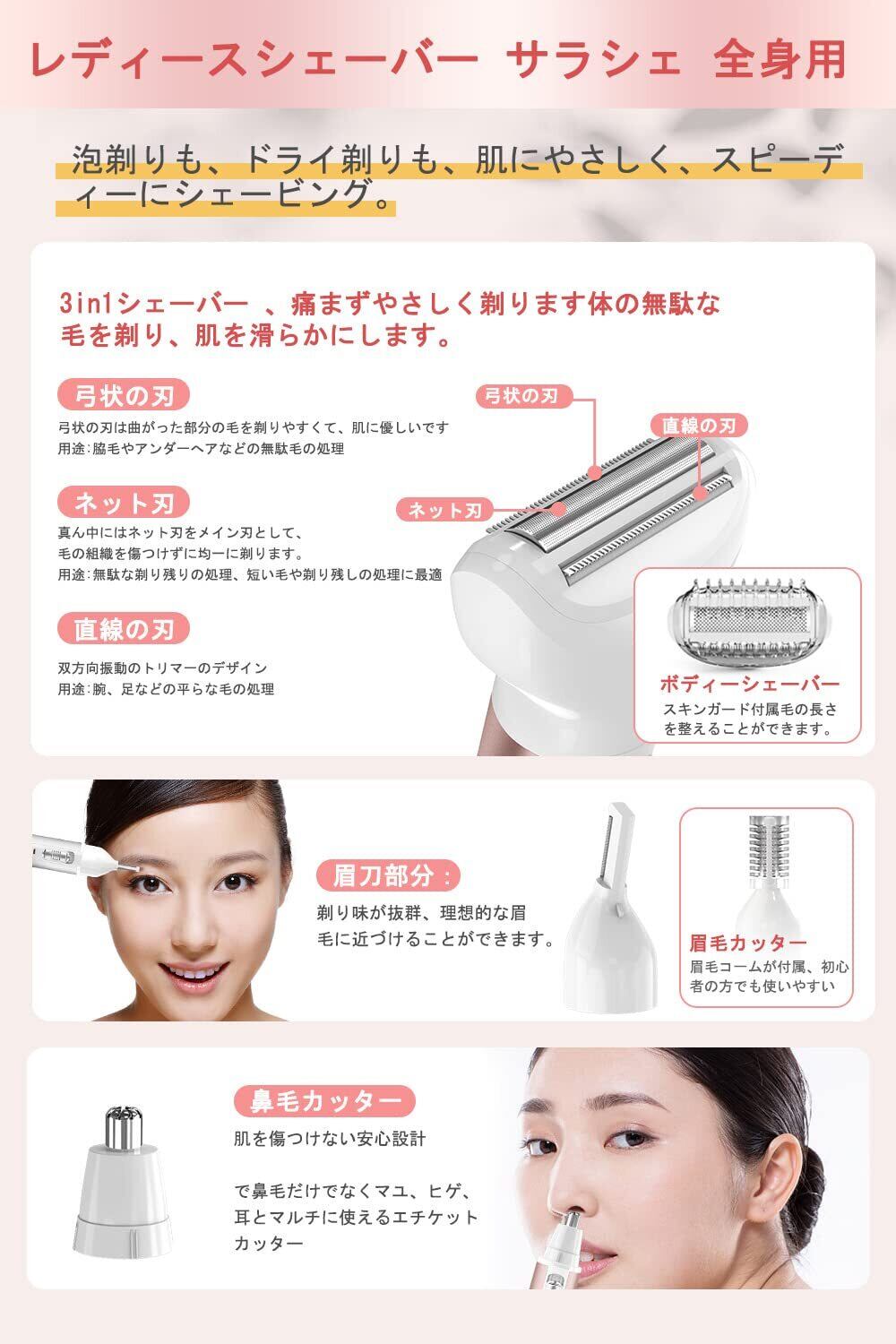 【肌にやさしい&5つのヘッド交換が簡単 】レディースシェーバーは高品質のアレルギー防止ステンレス刃を使っており、肌デリケートな部分の処理も肌に負担をかけずに処理することができます。独特丸い刃先で肌にやさしい。約0.12 mmのうす刃で根元からカット。肌の凹凸に合わせて動く密着スイングヘッドで肌にやさしくシェービング。肌を傷めずに、やさしく深剃りが可能です。5つのヘッドの付け替えがすごい簡単で使いやすいです!効果的に長い毛、短い毛、クセ毛またはムダ毛の根元から取り除けます。(暖かいヒント:電気シェーバーを使用した後は、必ず保湿ケアすることをおすすめします。普段お使いの化粧水や乳液で良いので、忘れずに保湿をするようにしてください。)
