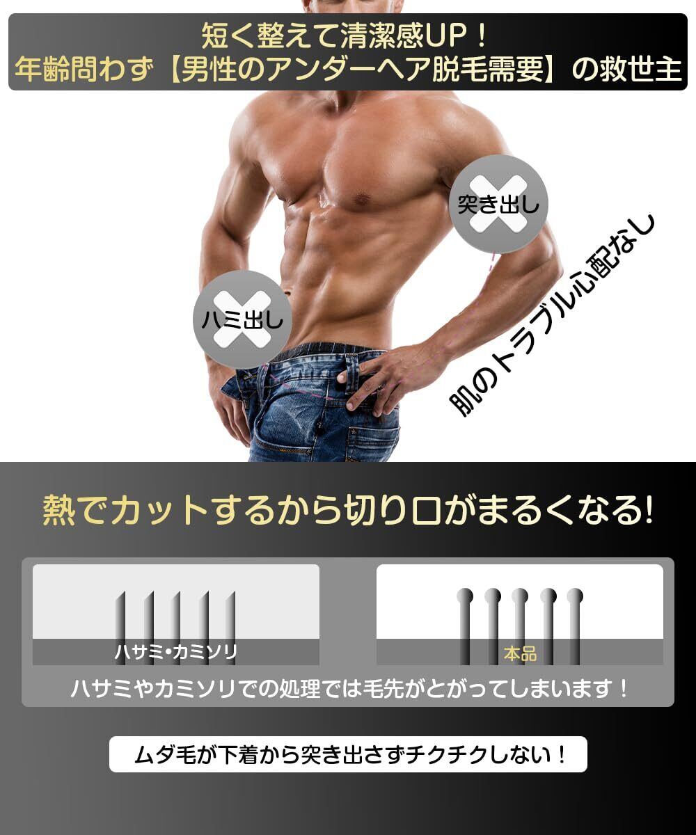 【熱線処理&衛生的】男性用シェーバーとカミソリでアンダーヘアを処理するなら、肌が炎症を起こしやすいし、剃り跡が目立ったり形が整えにくいです。アンダーヘアカッターは熱線技術を利用し、直接肌に触れずに引っかき傷による炎症などの一連の問題を避けます。多用シェーバーに比べて、ビキニライン専用トリマーだので、細菌感染を減らし、炎症やダメージ起こしない!衛生的に使用できます。日本語説明書付き、操作簡単、アンダーヘア処理になれていない方でもすっきり使用できます。