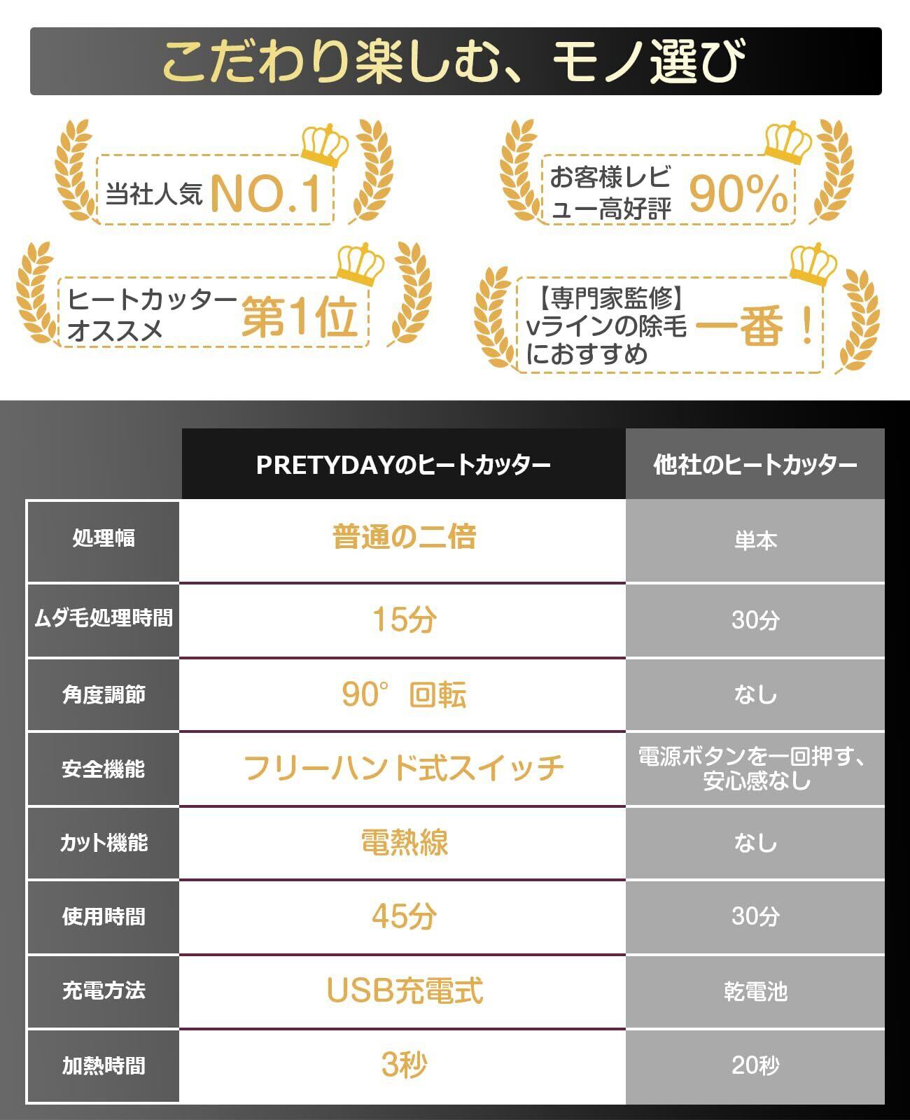 【90°回転可能なヘッド&きれいに剃る】カッターヘッド部分は90°の範囲で自由に回転可能なので、細かいところまで丁寧にカットできて、ムダ毛処理はより便利でやすくなります。カットできる長さは根元から約1cm以上。ヒートカッターはアンダーヘアを根元から剃る商品ではありません。電熱で無駄毛の先端を焼き切る方式により、切断面を丸くし、皮膚に刺激を与えず、炎症やダメージ起こしない!使用完了後、付属のブラシで発熱線に残った焦げものを取ることができます。