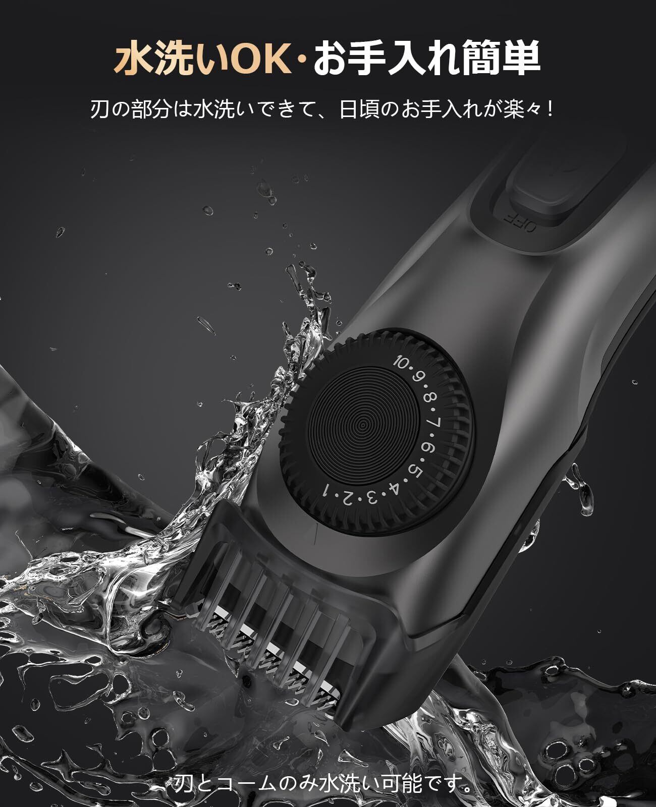 【水洗いOK&安全清潔】髭トリマーの刃は水洗いでき、毛クズを洗い流せて、お手入れラクラク。刃に付着した皮脂汚れ洗浄し、切れ味が衰えなく清潔で保ちます。刃先やコームが丸みを帯びており、ヒゲを起こしてからカットすることで肌へのダメージを抑え、敏感肌の方でも安心して使えます。