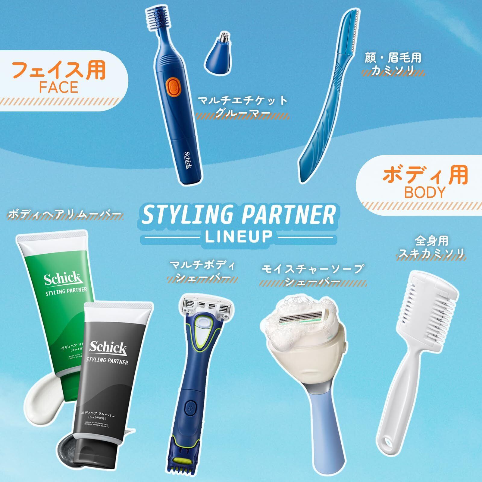 ●肌に優しいボディ用5枚刃+電動スキカミソリ●毛をすく・剃る、肌を潤すをこれ1本で。●電動スキカミソリ●長い毛をすっきり整えられる電動スキカミソリ●肌潤う、快適な剃り心地。肌に優しいボディ用5枚刃●水に触れると溶け出すモイスチャージェル(シェービング剤*ヒアルロン酸配合)●刃の1枚1枚についた独自のスキンガードが、肌への負担を減らします。●スキンフィット5枚刃。身体のカーブにそって、簡単にしっかり剃ることができます。●刃:アメリカ、トリマー:中国、ホルダー:中国、シェービング剤:中国