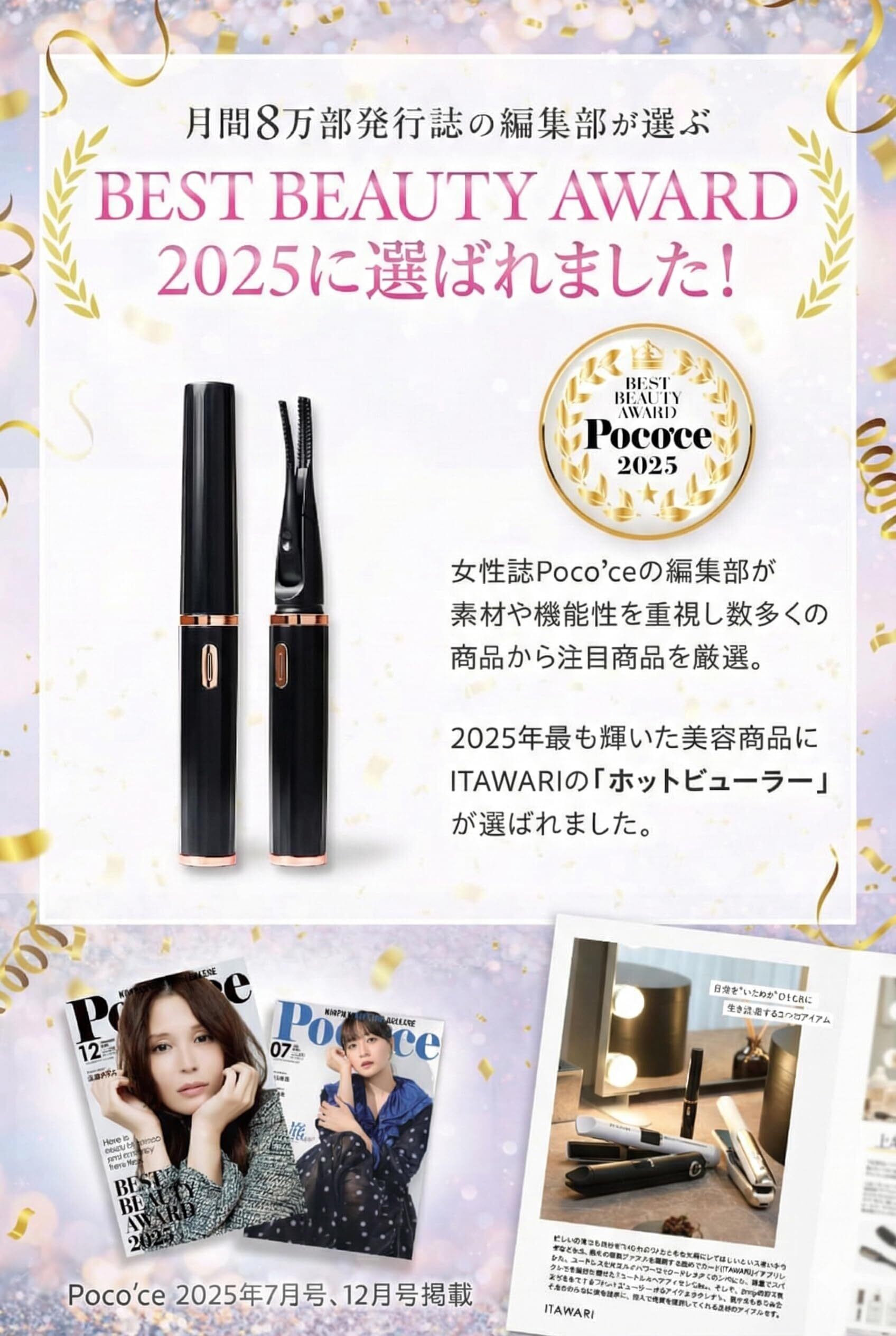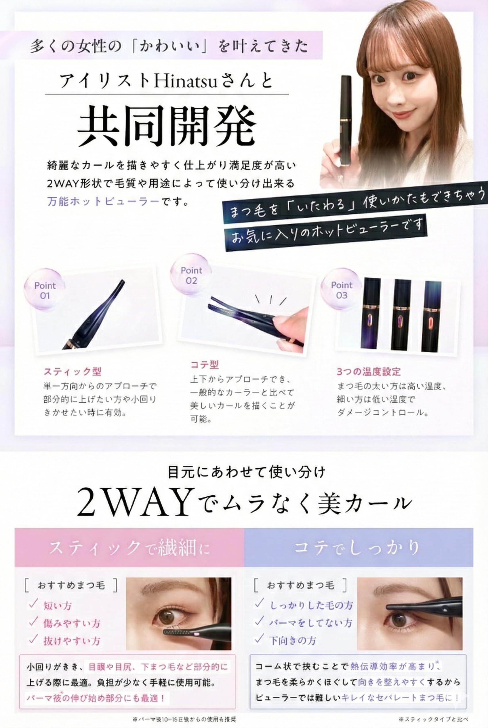 【表参道アイリスト共同開発】 表参道のアイリストHinatsuさんと自宅でも扱いやすいホットビューラーをテーマに開発しました。まつ毛の根元を立ち上げやすく毛先も整いやすい設計で普段のメイクにも取り入れやすい仕上がりに仕上げています。実際のサロン現場の声を取り入れながら使いやすさと仕上がりのバランスにこだわりました。