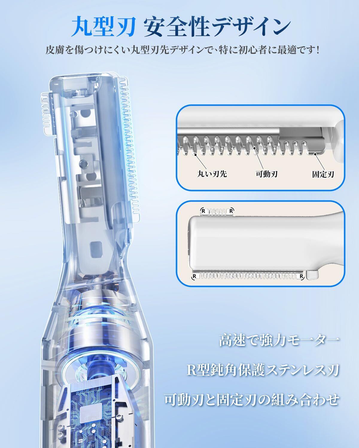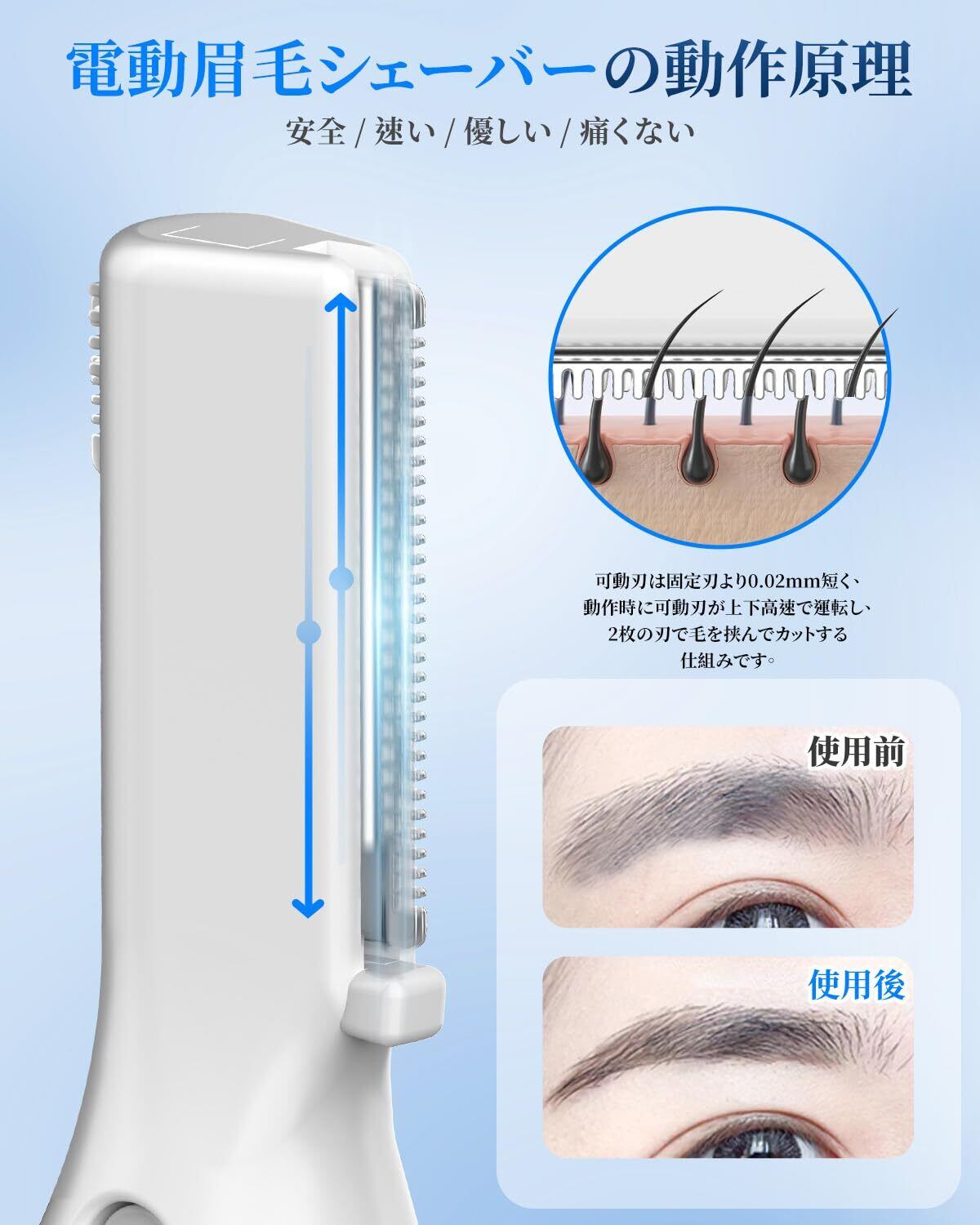 【丸型刃先&肌に優しい安全設計】この眉毛シェーバーは、可動刃と固定刃を組み合わせた毛髪カット設計を採用しています。中でも、肌に触れる固定刃は丸型の刃で、可動刃は固定刃より0.02mm短く設計されています。そのため、使用中に肌に優しく、安全性にも配慮されており、特に敏感肌にも対応しています。初心者でも安心して使える眉毛シェーバーです!