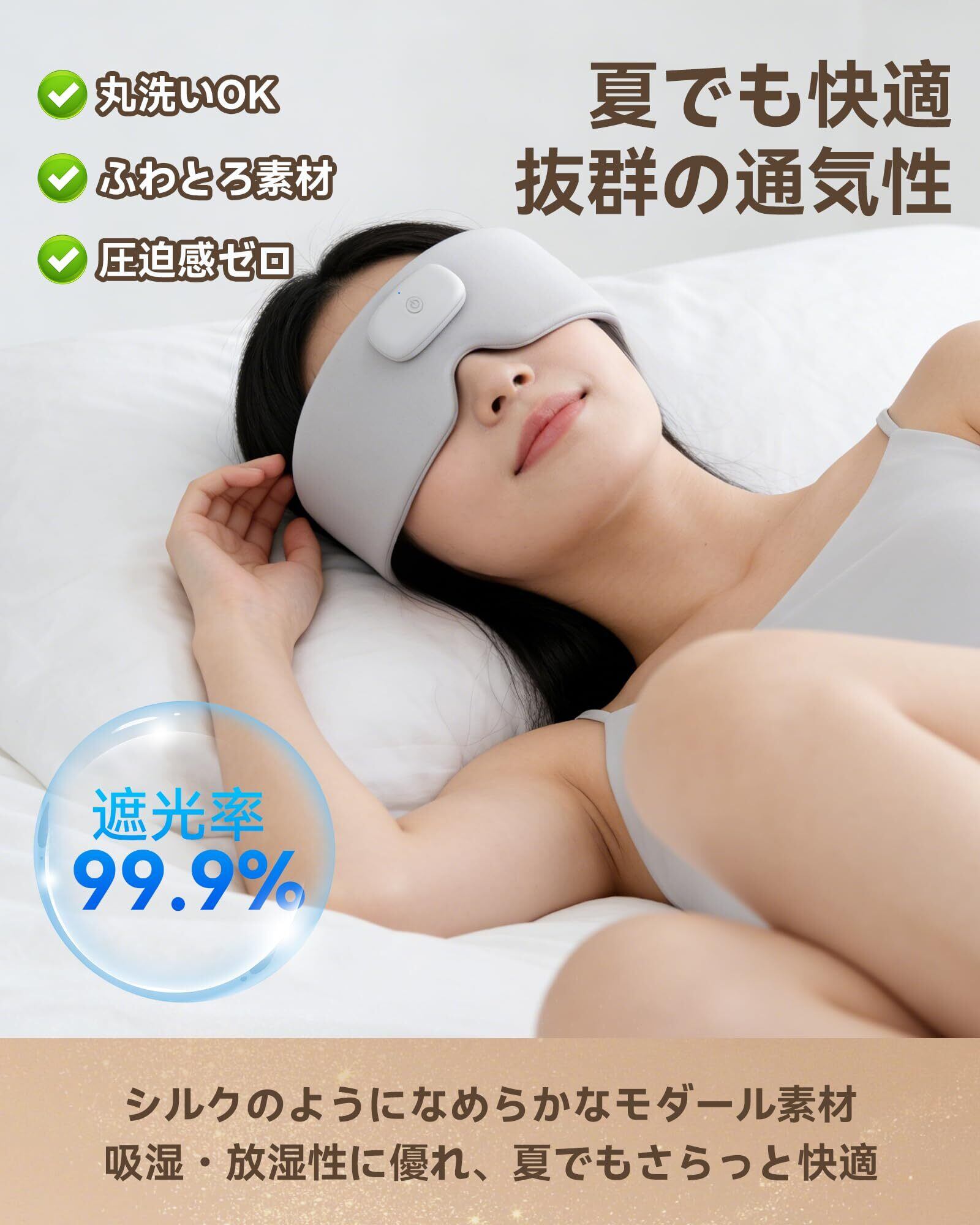 人間工学に基づく3D立体構造・完全遮光&コードレス仕様。 目元のカーブに沿う3D立体デザインで光をしっかり遮断し、明るい環境でも深い暗さを保ちます。コードレス・USB充電式なので、寝返りをうっても邪魔にならず、どこでも自由に使えます。また、操作時には分かりやすい日本語の音声ガイドを採用し、初めての方でも迷わず設定できます。