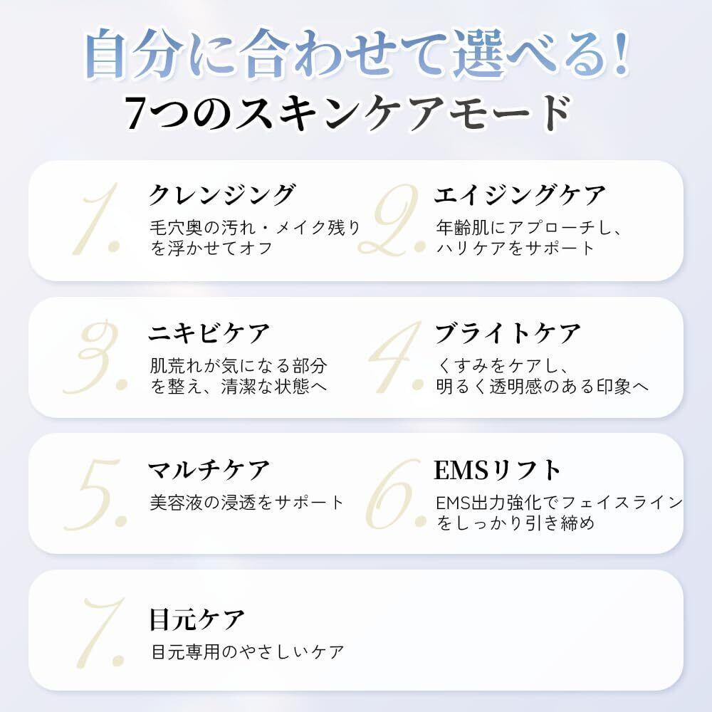 【選べる7つの専用モード・毎日10分で自信の素肌へ】 お肌の状態や目的に合わせて選べる、7つの多彩なケアモードを搭載しています。クレンジングから保湿、話題のリフトケア*¹、エイジングケア*²まで、トータルでお肌をサポートします。1日たった10分の簡単ステップでOKです。28日間、毎日の習慣にすることで、肌の変化を実感し、自信の持てる理想の素肌を目指しましょう。