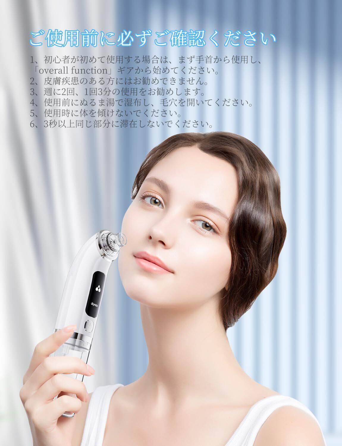 【ご使用方法】1.洗顔後、温タオルで毛穴を開きます(顔にのせてください)。2.適切な吸引ノズルを取り付けてご使用ください。美容液やその他製品との併用も可能です。3.使用後はパックをして、肌を潤いとハリで満たしましょう。ご注意:同一部位に3秒以上使用しないでください。ご使用は週1~2回、1回あたり8分以内を目安とし、お肌の状態に応じて調整してください。