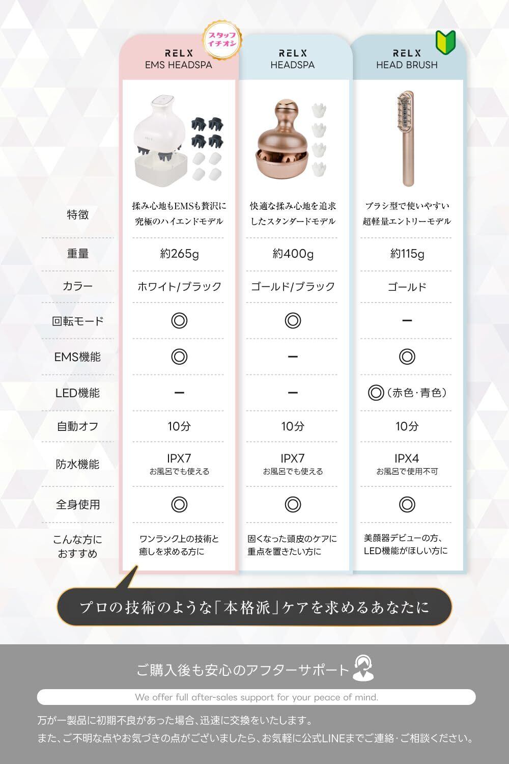 【選べるモード&2種類のEMSリズム】 RELX(リラクス)ヘッドブラシは、『EMSモード単体』『LEDモード単体』『EMS+LEDモード』の3種類を搭載。さらに、2パターンのEMSリズムと、4段階の出力レベルから、お好みのモードをお選びいただけます。 超軽量&ラウンド型設計で、身体や頭皮・フェイスラインに沿いやすく、心地よい使用感をサポートします。毎日のセルフケアに取り入れやすい設計です。