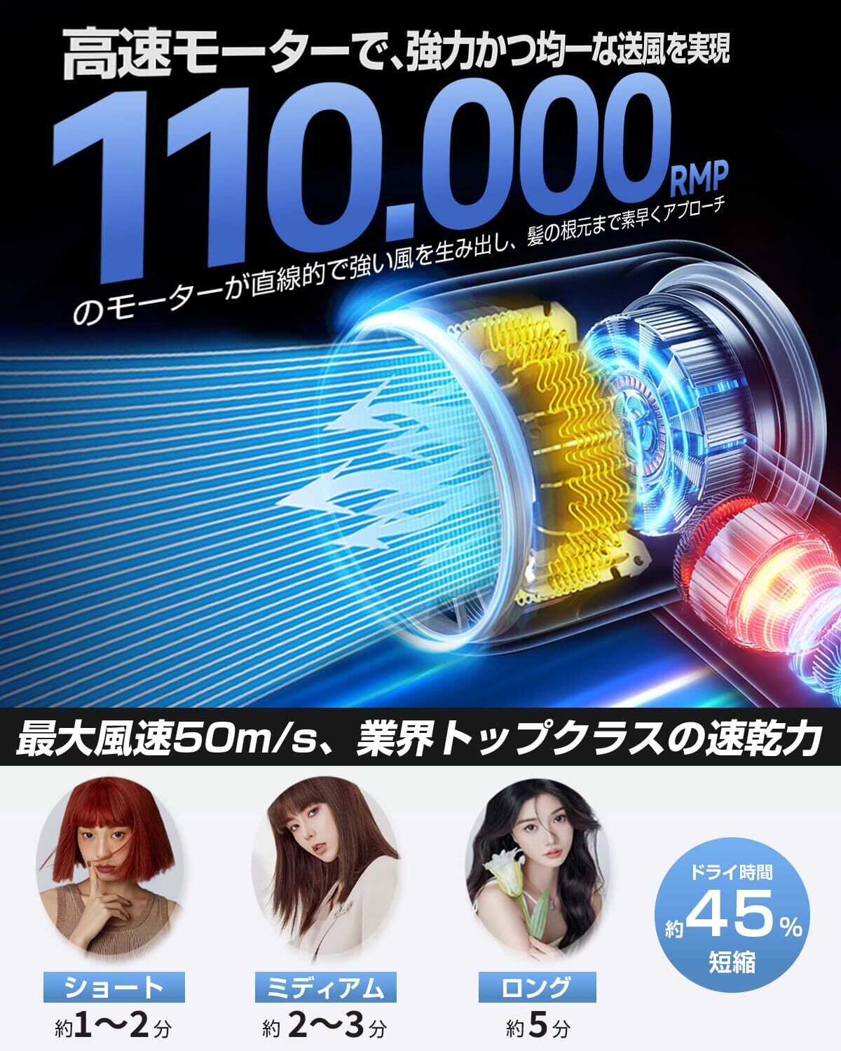【毎分11万回転のモーターで、最速の乾燥力】高性能なブラシレスDCモーターを搭載し、毎分110,000回転の高速回転で最大50m/sの大風量を実現。短髪なら約1分、中髪約2〜3分、長髪でも約5分でスピード乾燥可能です。ロングヘアや毛量の多い方でも時間をかけずにしっかり乾燥。風速重視の構造により、従来ドライヤーよりも低温で効率よく乾かせるから、熱ダメージの少ない髪に優しい設計です。熱に頼らず風力で乾かすから、カラーやパーマ後の髪にも優しい。さらに、低温でも速乾できるから、ドライ時間を短縮=消費電力の節約にもつながる。