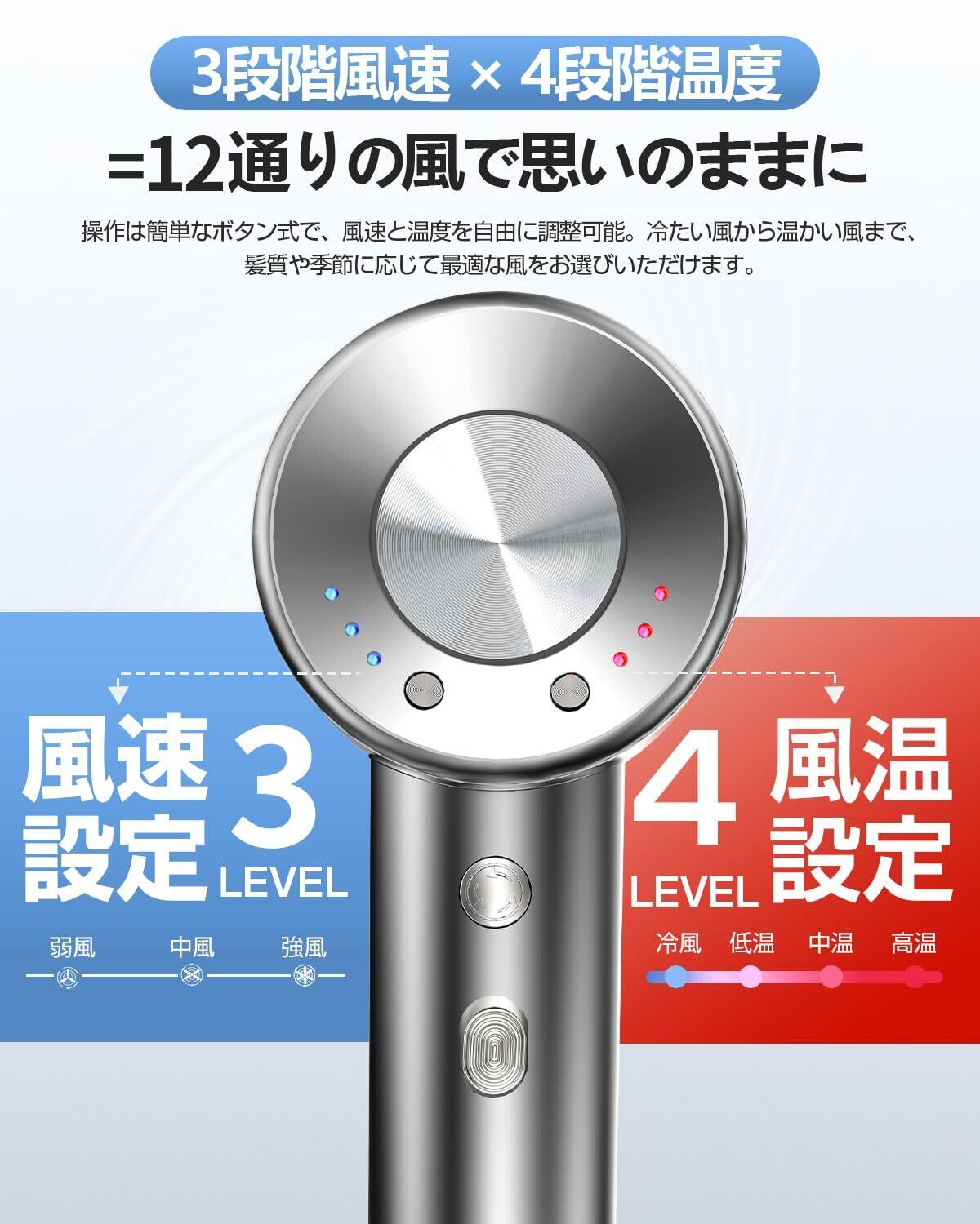 速乾 × 美髪 × 安全設計を、これ一台で。革新的な構造と110,000rpm高速モーターを搭載した次世代型「GS87ヘアドライヤー」。風速・温度の組み合わせは12通り。高濃度マイナスイオンによる髪へのやさしさ、静音・軽量設計による使い心地、そして三重の安全保護機能も備えた1台です。家族みんなのヘアケアを、もっと快適に、美しく。️【12通りの風モードで、あなただけの乾かし方を】GS87は、3段階の風速と4段階の温度設定により、合計12種類の風モードを実現。冷風から高温まで幅広く対応し、髪質・長さ・季節に合わせて最適な乾燥体験が可能です。操作は直感的なボタン式で、初めての方でも簡単。