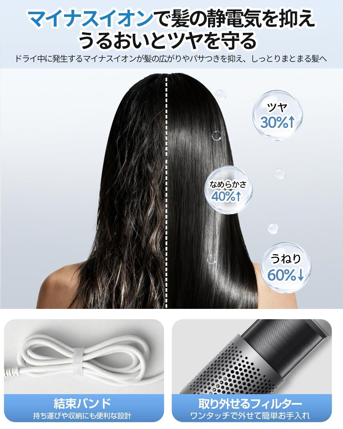 ✨【高濃度マイナスイオンで、ツヤと潤いを守る】GS87はマイナスイオン発生機を内蔵し、髪全体にイオンを均一に届けます。乾燥時に発生する静電気を抑え、広がりやすい髪もまとまりのあるツヤ髪に。マイナスイオンは、髪の表面にあるキューティクルの開きを抑え、水分の蒸発を防ぐ働きがあります。実験では、使用前と比較して+30%の光沢、+40%のなめらかさ、−60%のうねり改善が期待できる結果が得られています。※自社テスト結果に基づくもので、効果には個人差があります。ドライヤー時間が、ヘアケアの時間に変わる感動を。※低温または冷風が出てマイナスイオンが発生します。