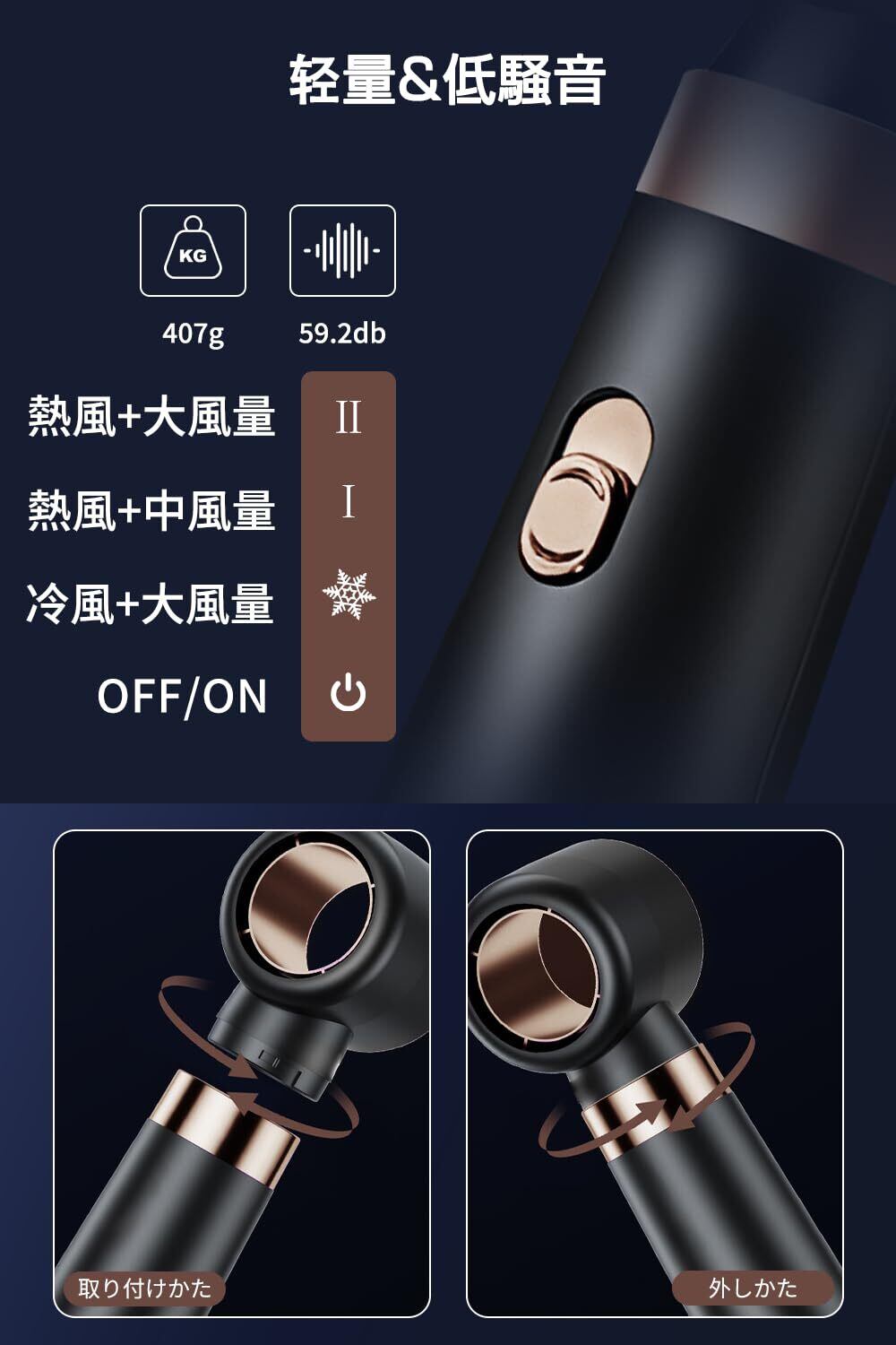 【大風量&3段階調節】のドライヤーは高出力モーターを搭載し、短時間ですばやく乾かします。高速冷風-中速熱風-高速熱風の3つのギアで調節できます。3段階の風速調節と組み合わせて、さまざまなスタイリングに対応し、片手で操作できます。
