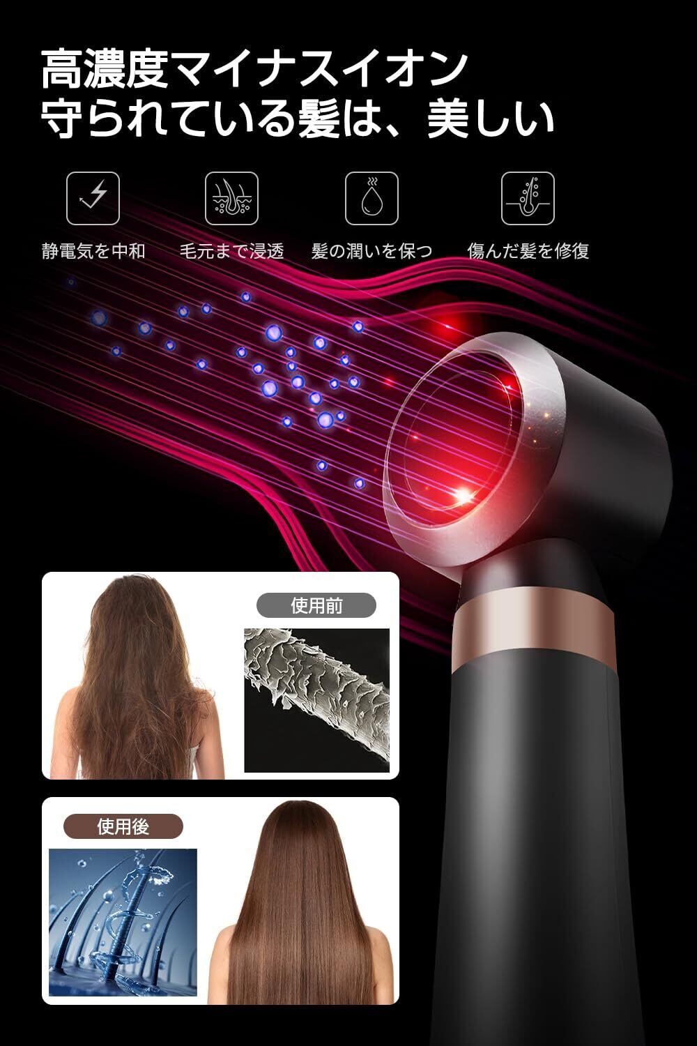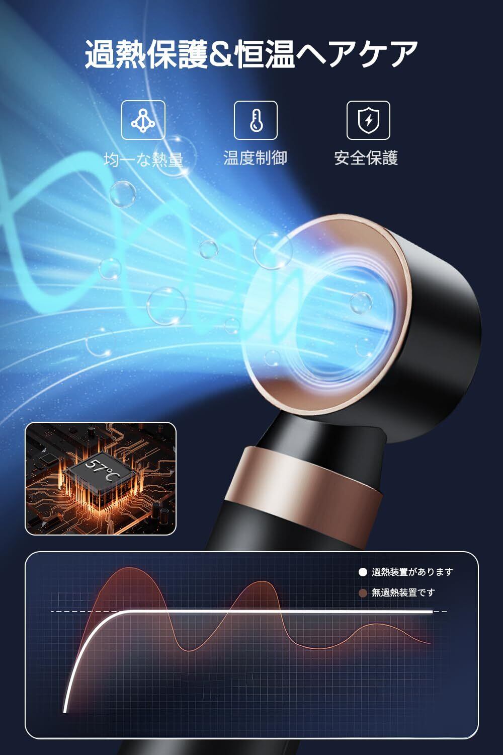 【マイナスイオン& 4大スマート保護システム】このヘアドライヤーは、高濃度のマイナスイオン装置を内蔵して、髪から根元まで静電気を保護するためにマイナスイオンを大量に放出することができます。4大スマート保護システムを持っています:スマート温度制御システム(58回/秒リアルタイムで正確に温度を制御して過熱損傷を防止します)、過熱断電保護チップ(設備温度が高すぎて、直ちに電力供給を停止します)、電磁放射を下げます(放射線の危害を遠ざけます)、精選純銅線コア(安全がされています)