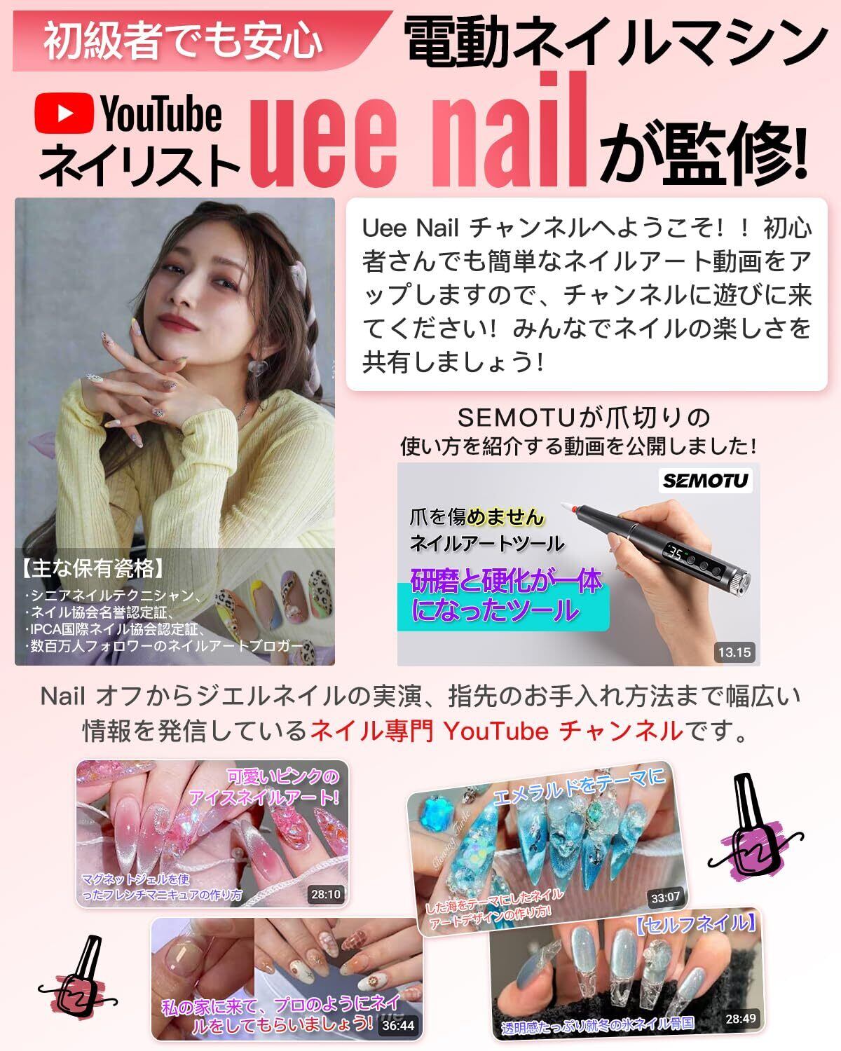 【登録者数98,200人突破!人気Youtuberが監修】人気YouTuberネイリストのuee nailさん監修「より使いやすいネイルマシン」を目指し開発された 2in1 電動ネイルマシンです。ソーシャルメディア上でも多くの方から絶賛され、大変好評を得ています!基礎のネイル除去から UV ジェルの硬化まで、一台ですべてのニーズに対応、自宅で手軽にサロン級の仕上がりのネイルを作れるので、時間もお金も大幅に節約できます。
