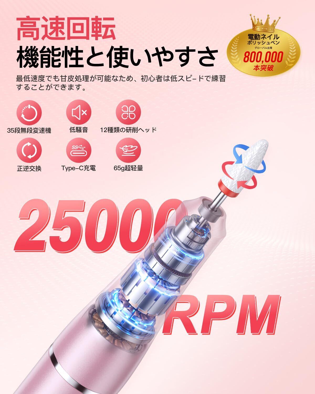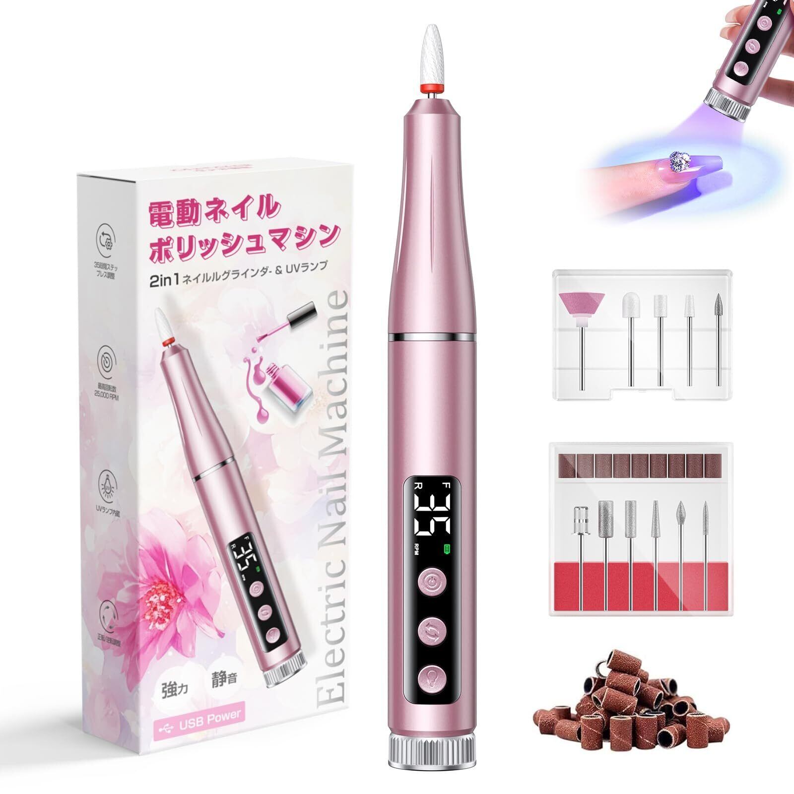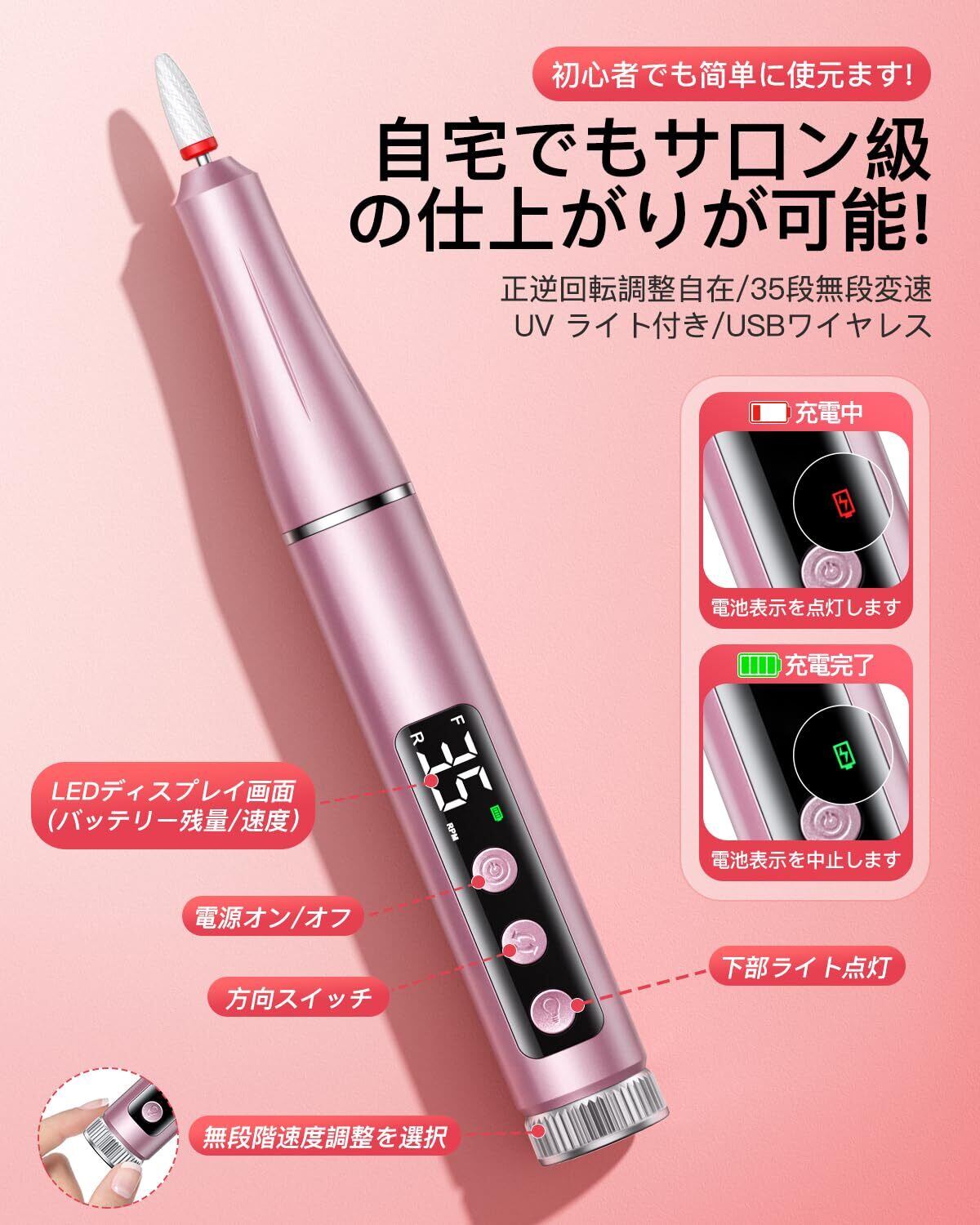 ネイルマシン 爪磨き電動 ネイルライト ネイルマシーン 甘皮処理 多用途 35段&無段階調速 正逆回転 USB給電 超静音設計 65g超軽量設計セルフネイル 12種類のプロフェッショナルビット&36個のサンディングバンド