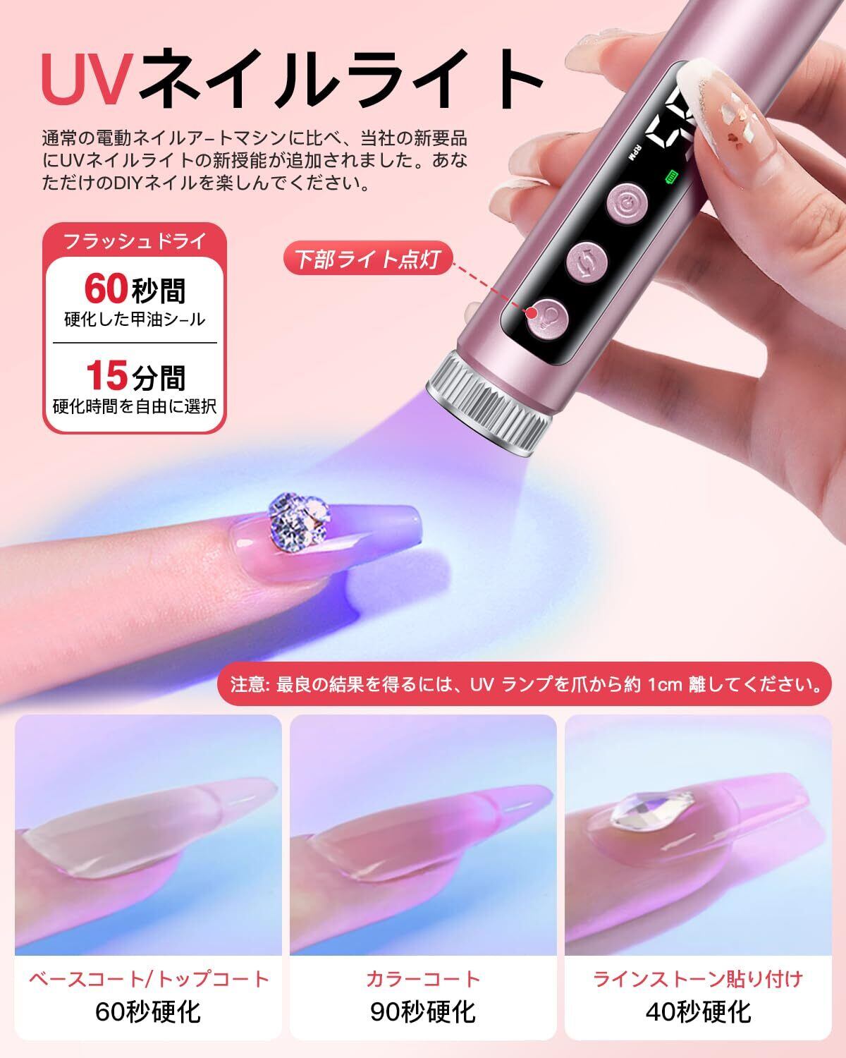 【UV ネイルライト搭載】このネイルマシンは緩やかな昇温で硬化熱を抑える UV ライトを装備、ジェルネイルのシールは 60秒で硬化、大きな装飾品も 90 秒で固定可能です。UV ネイルライト、硬化スピード超速!UV 硬化でも手が黒くならない、究極のネイルライト!注意: 最良の結果を得るには、UV ランプを爪から約 1cm 離してください。