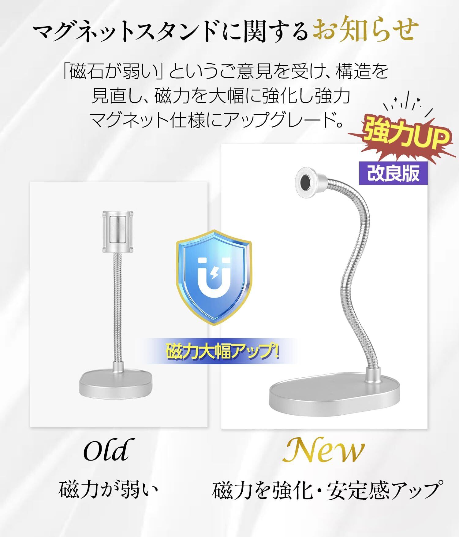 【強力マグネットスタンド付き】吸着式で好みの角度に自由調整可能。片手でも硬化しやすいフレキシブル構造。 マグネットスタンドにつきましては、 2026年よりお客様の声をもとに、スタンドの磁力が弱いとのご意見を受け、 より安定してご使用いただけるよう強力マグネットへアップグレードいたしました。 なお、切り替え期間中のため、一時的に旧仕様の商品が混在する場合がございます。 万が一、旧仕様の商品が届いた場合は、お手数ですがご連絡ください。