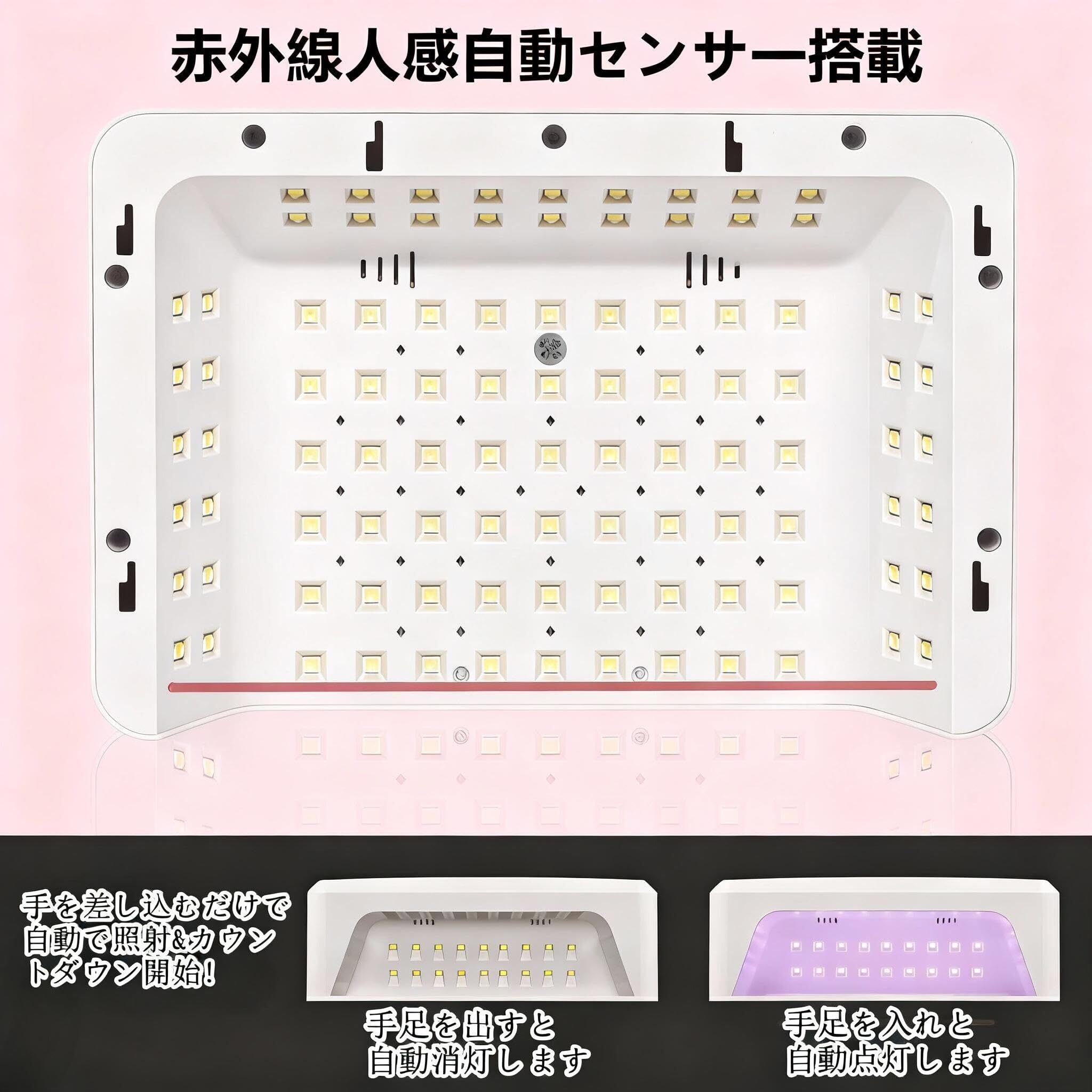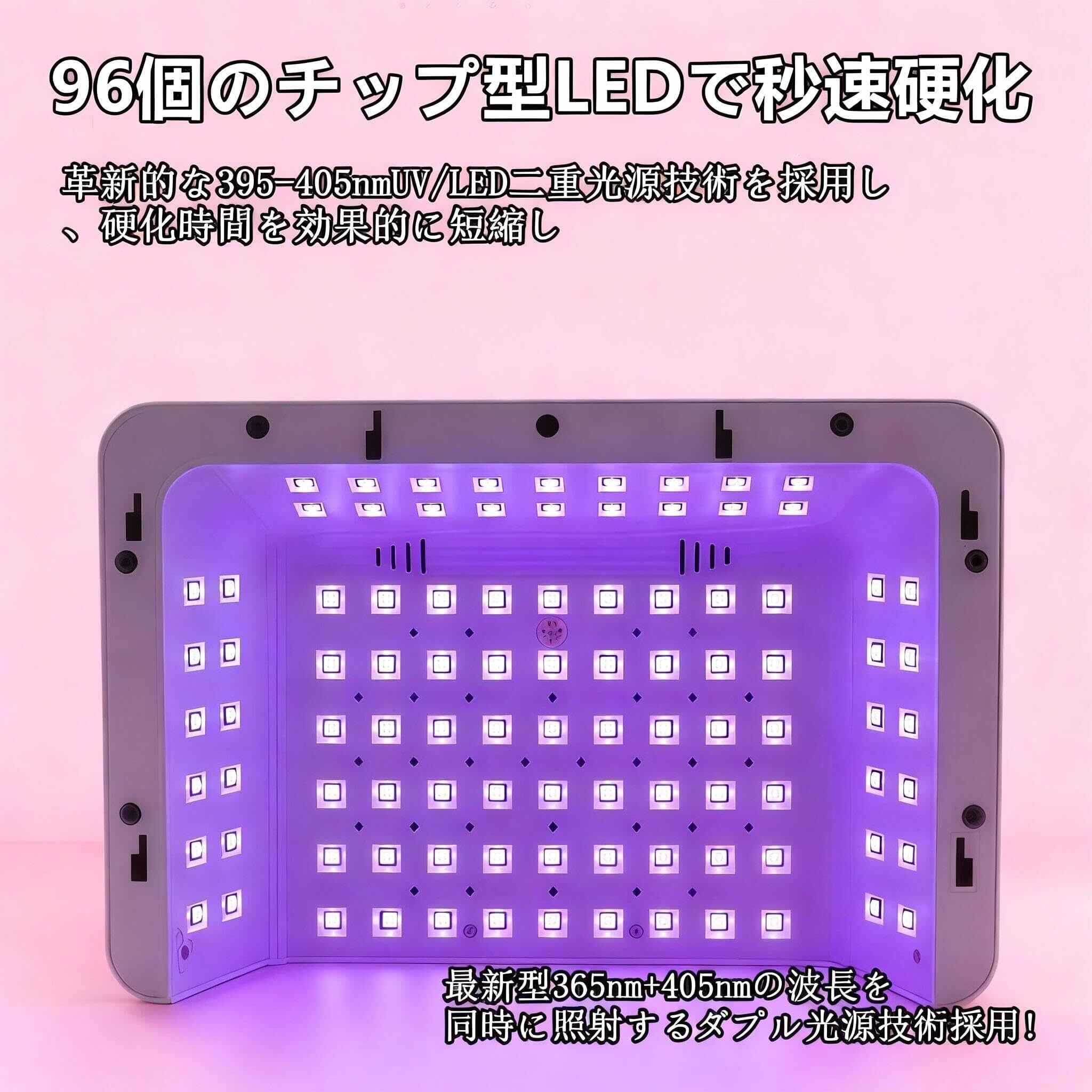【2026年 新 UVライト ネイル&UV/LED二重光源】レジン ライトが高速硬化390Wのハイパワーネイルライトです。革新的な395-405nmUV/LED二重光源技術を採用し、硬化時間を効果的に短縮し、従来のジェルネイルライトよりの3倍の速さで硬化することができます。レジンライトは96個のLEDランプビーズが配置されており、真上・奥・側面など、サイドや親指爪を均一に乾燥させることができます。ネイルアートやフットケア、マニキュアやレジンなどのサロンに対応しています。