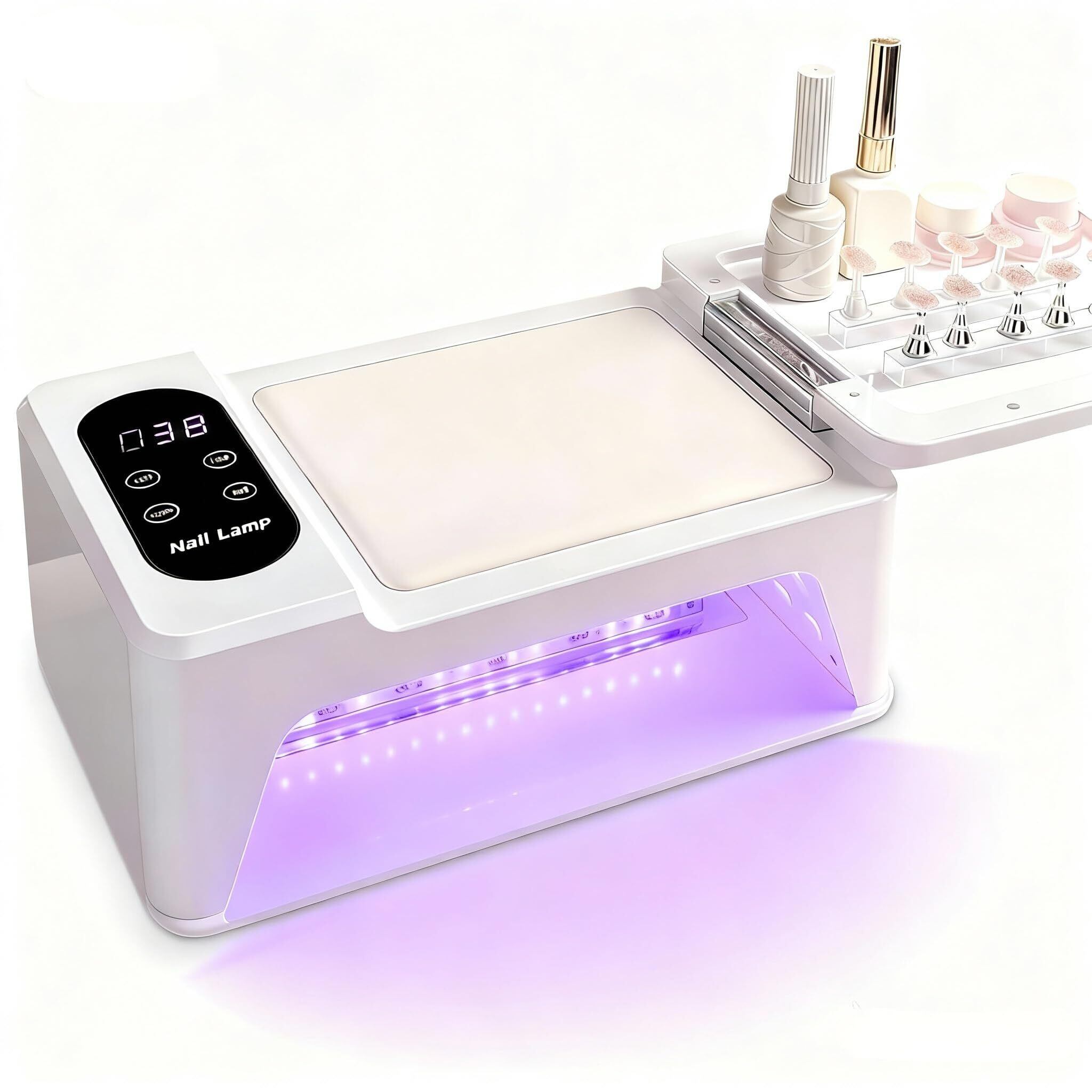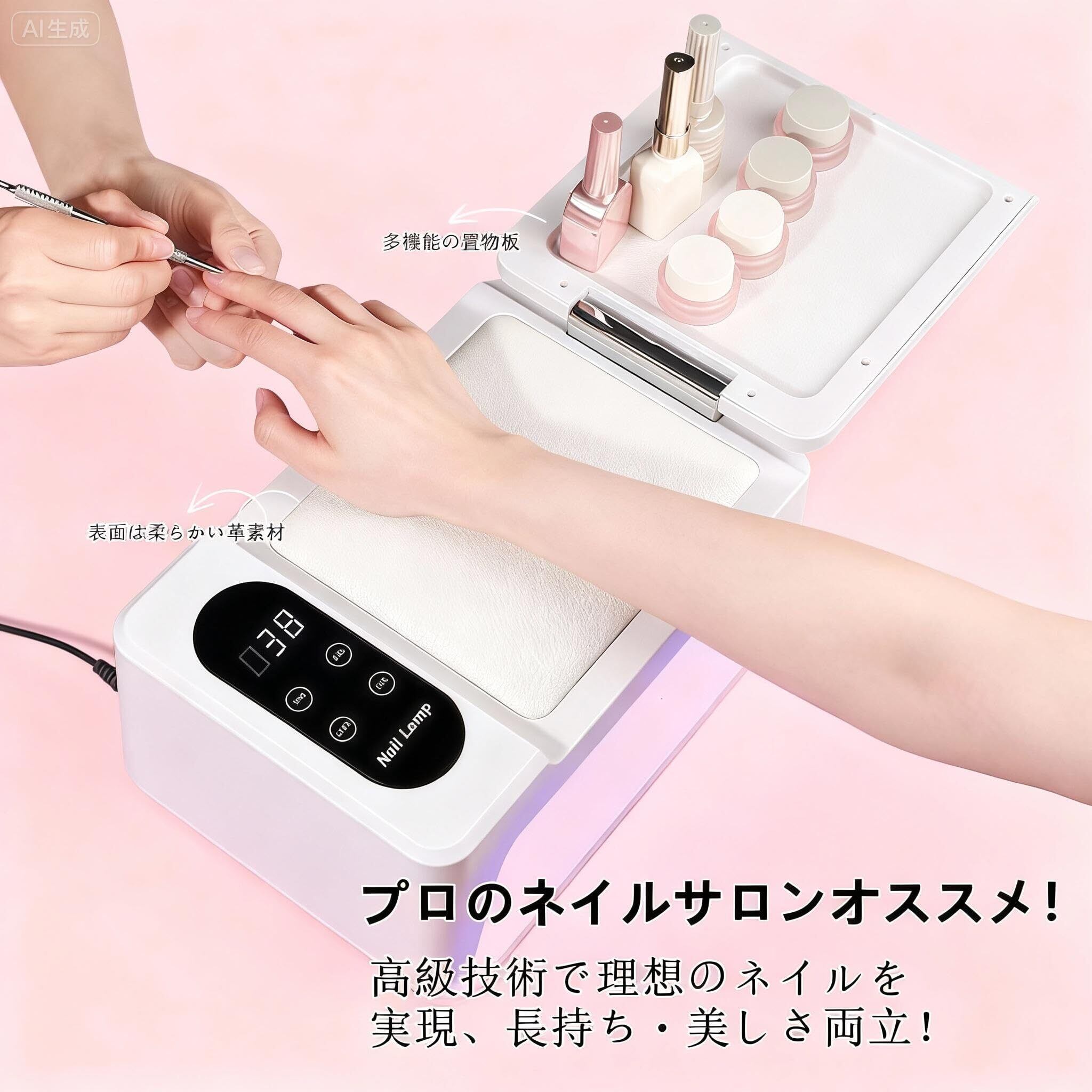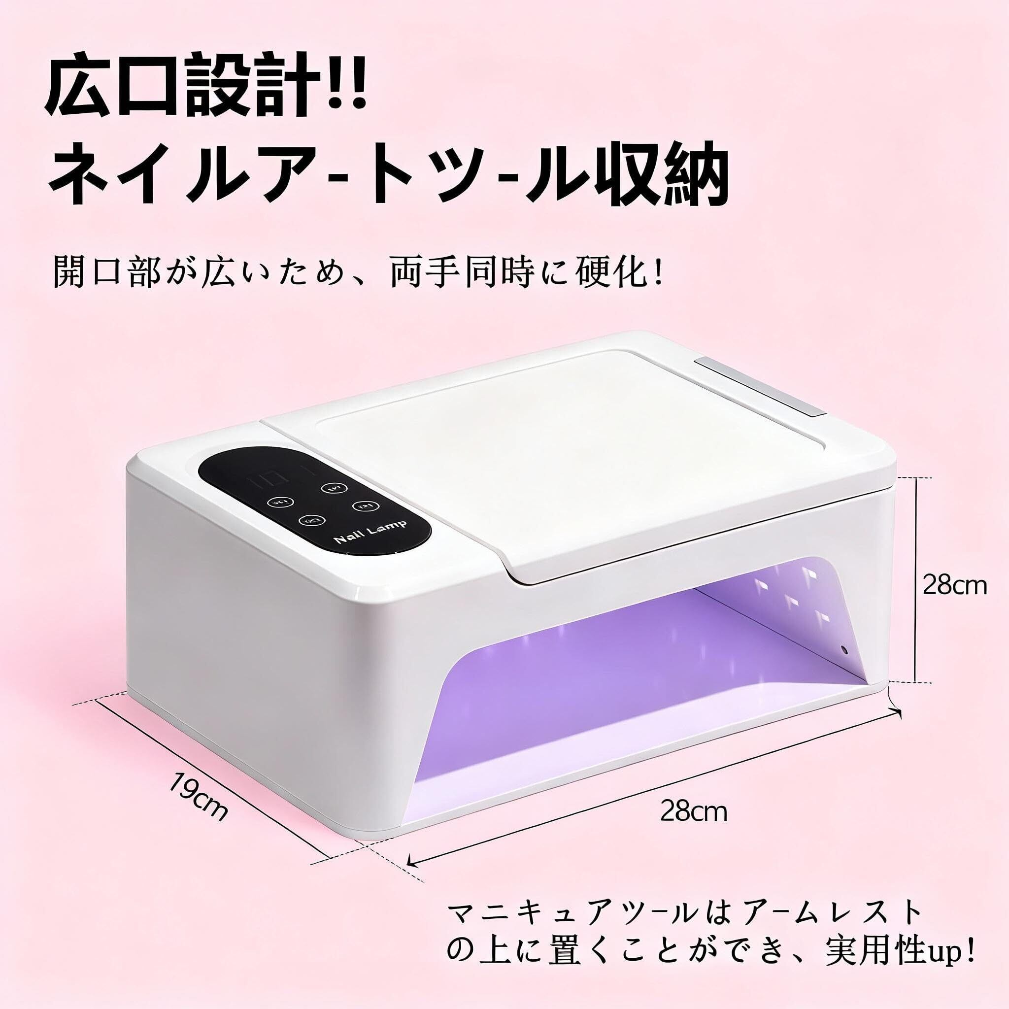 【超大な空間&3つ合わせた多機能デザイン】UV/LEDネイルランプ。おしゃれなネイルスタイルを演出し、折りたたみパネルのデザインで効率を向上させます。PU手枕は快適で手が疲れません。さらに、不使用中のネイルフィンガーレストやネイルツールを置くことができ、デスクスペースを節約できます。折りたたみパネルを閉じると、ネイルやツールを収納でき、開くと収納スペースが増えます。広々とした空間で、ランプの口は広く、内蔵の衝撃吸収ストリップにより、指をデバイスに入れた際の衝突を避けることができます。両手・両足・数組の指レストを収容でき、豊かなネイルの楽しみを味わえます