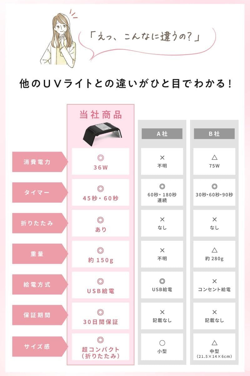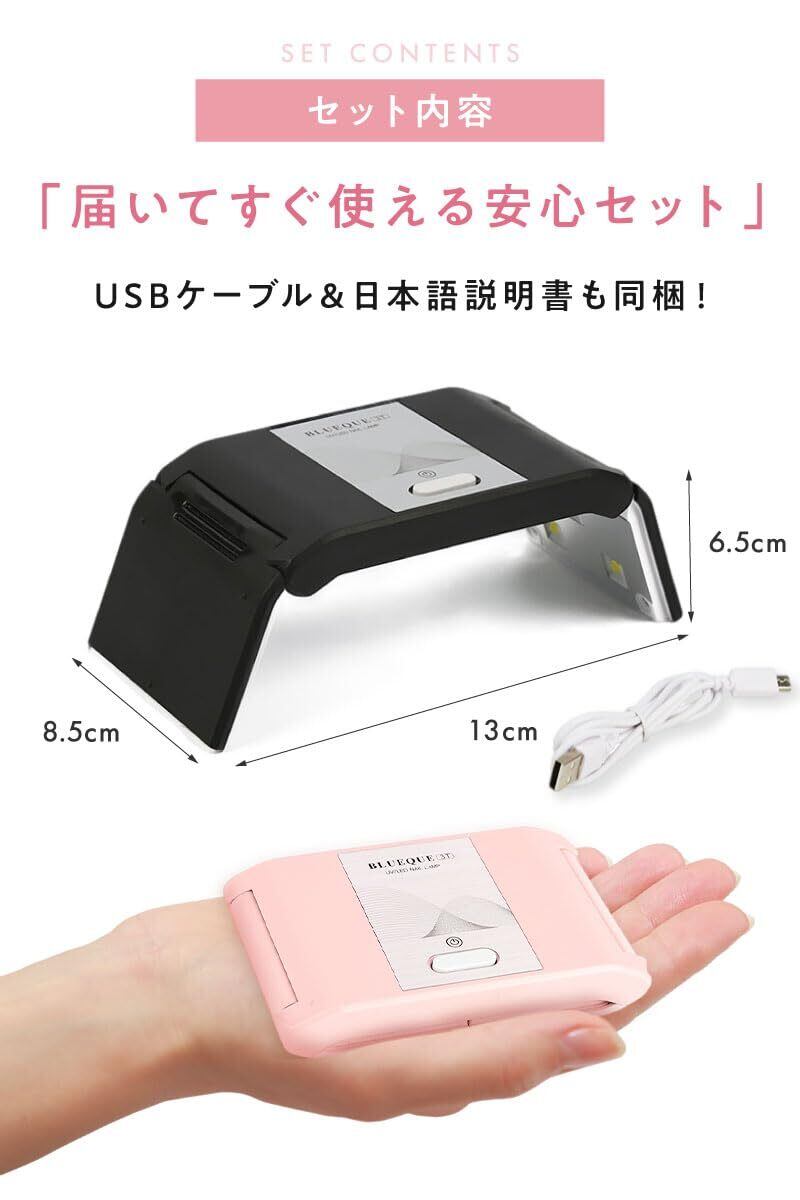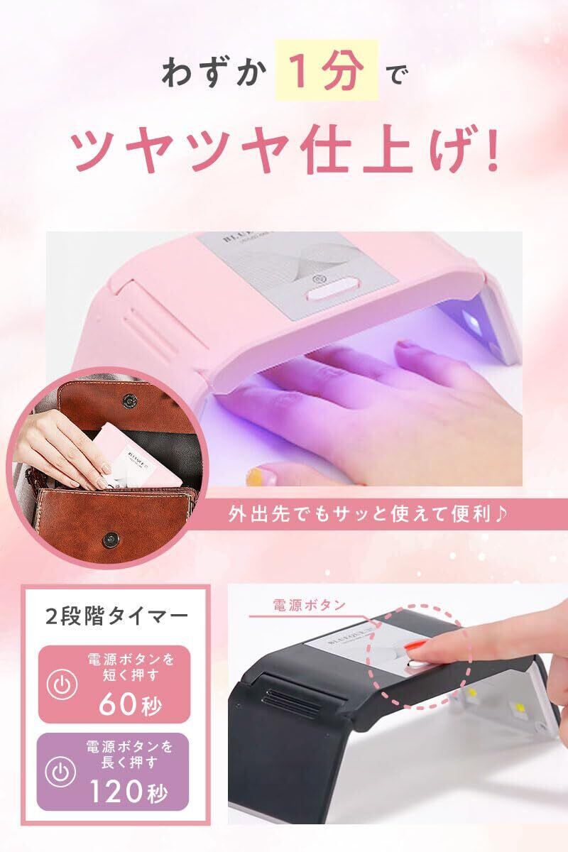 高速硬化でプロの仕上がり!UV・LEDネイルライト ■コンパクトなのにハイパワー 最大出力36w! しっかりムラなく硬化できます。 ■鏡面反射で高速硬化 上部・左右が鏡面仕様になっているので、 隅々まで光が反射し高速で硬化することができます。 ■UV・LEDのダブル光源 UV&LEDふたつの光源が備わっているので、 ほぼ全てのジェルネイルが硬化できます。 レジンにも使用可能! (※ほぼ全てのジェルやレジン液に対応しておりますが、 お使いの商品によっては硬化しにくい場合がございます。 波長をご確認の上ご使用下さい。) ■持ち運びにも便利 折りたたんで小さくおさまるコンパクトサイズなので 外出先にも手軽に持ち運びいただけます。 ■便利なタイマー機能搭載 60秒・120秒の2種類のタイマー機能を搭載しているので 用途に合わせて使用できます。 【カラー】 ブラック/ホワイト/ピンク 【サイズ】 横約13cm×縦約8.5cm×高さ約6.5cm 【操作方法】 電源ボタンを短く押す→60秒、長く押す→120秒