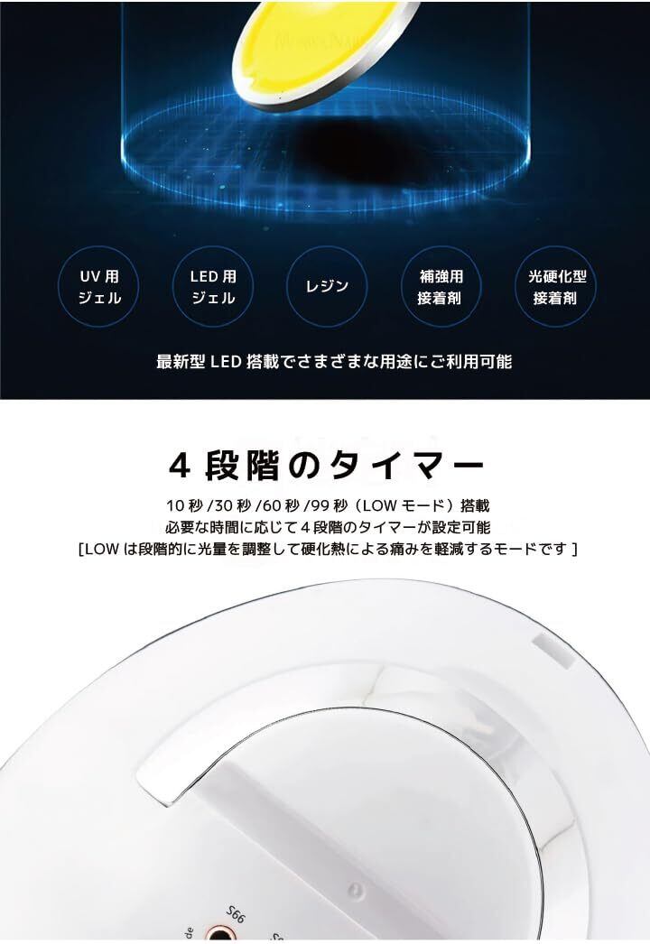●【4つタイマー&二重光源】この硬化UV LEDライトには4つタイマー(10s / 30s / 60s / 99s)があり、爪の硬化の程度に応じて時間を調整できます。設定時間は、使用するマニキュアによって異なります。 また、ローヒートモード搭載(99秒カウント) ①「99S Low Heat Mode」のボタン押すとローヒートモードになり、99秒間ライトが 点灯致します。※このモードは、秒数が増えるごとにライトの光度が変わり硬化による 痛みを低減させる効果のあるモードとなります。