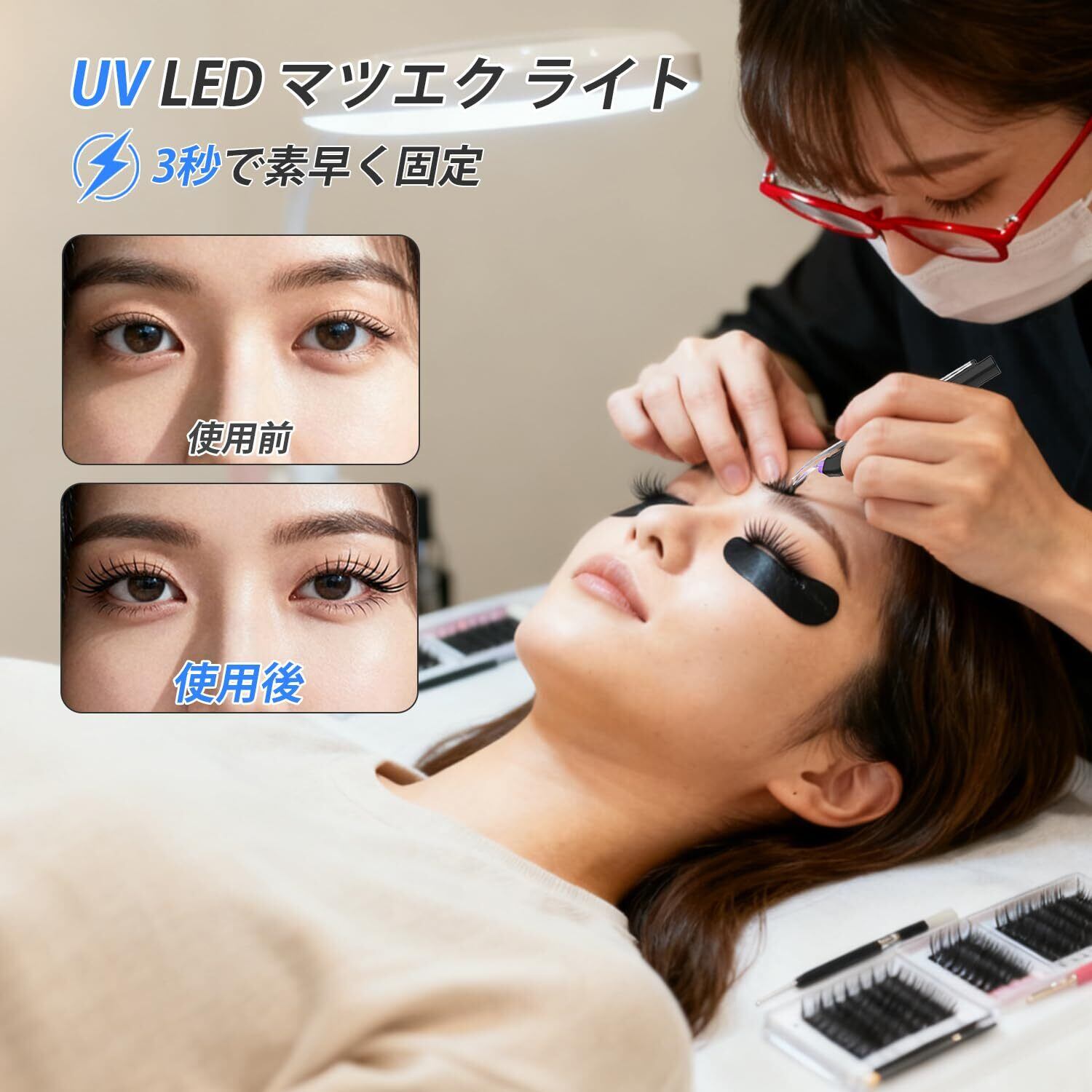 【3秒急速硬化、120時間以上持続】当社のLEDまつげエクステランプは、波長405nmのUVライトを使用し、わずか3秒で接着剤を速乾します。接着剤が残らず、まつげエクステの次のステップにすぐに進むことができます。簡単、快適、そして安全で、アレルギーをお持ちの方にも最適です。まつげエクステは長持ちし、強度と耐久性に優れています。少なくとも120時間持続するので、つけまつげが落ちる心配もありません。
