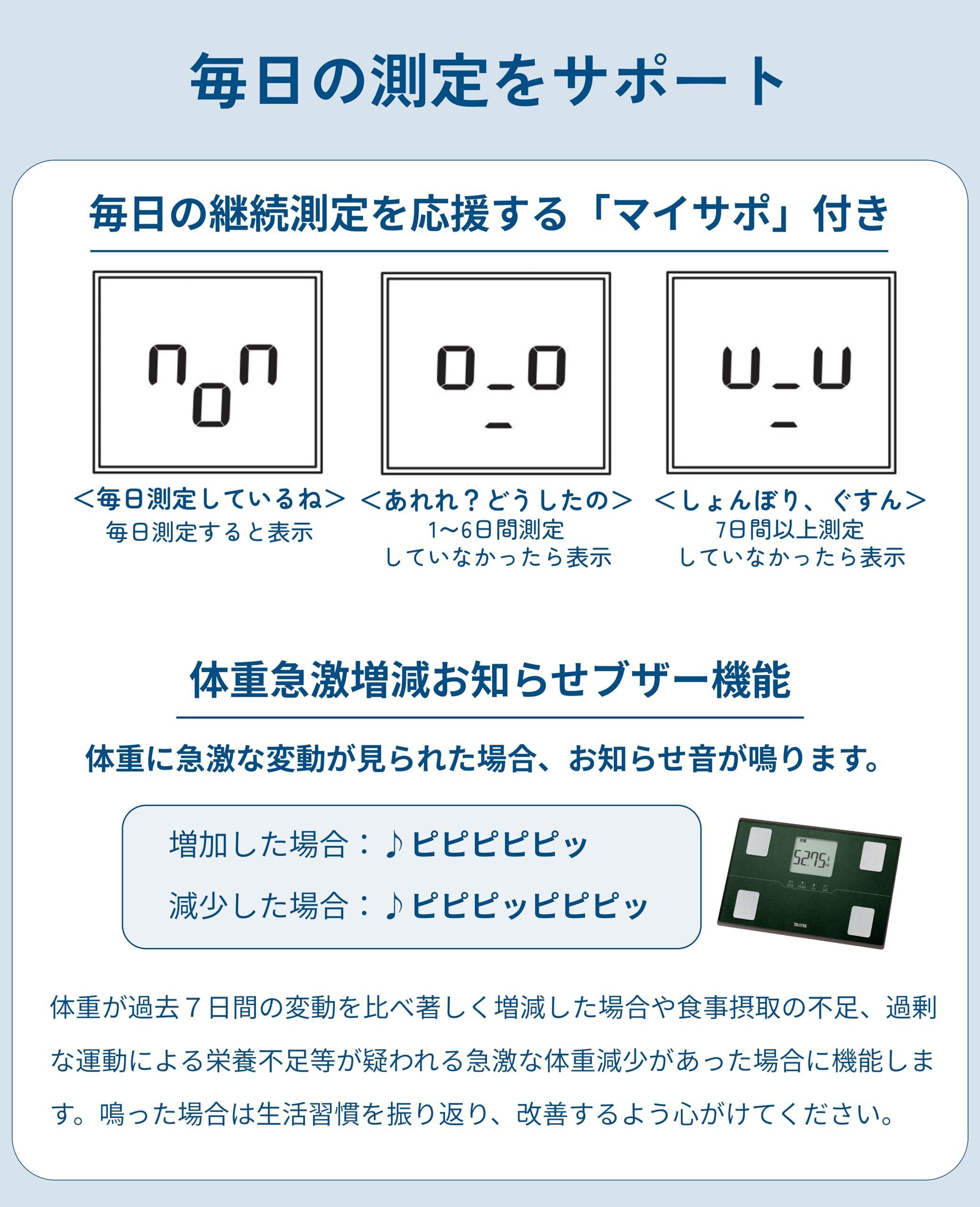 測定項目:体重、BMI、体脂肪率、筋肉量、推定骨量、内臓脂肪レベル、基礎代謝量、体内年齢