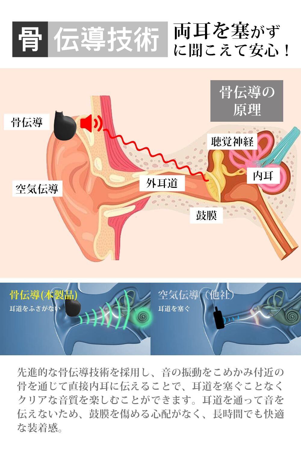 【革新的な骨伝導技術】先進的な骨伝導技術を採用し、音の振動をこめかみ付近の骨を通じて直接内耳に伝えることで、耳道を塞ぐことなくクリアな音質を楽しむことができます。耳道を通って音を伝えないため、鼓膜を傷める心配がなく、長時間でも快適な装着感。両耳を開放したまま周囲の状況を常に把握できるため、外出先でも安心です。