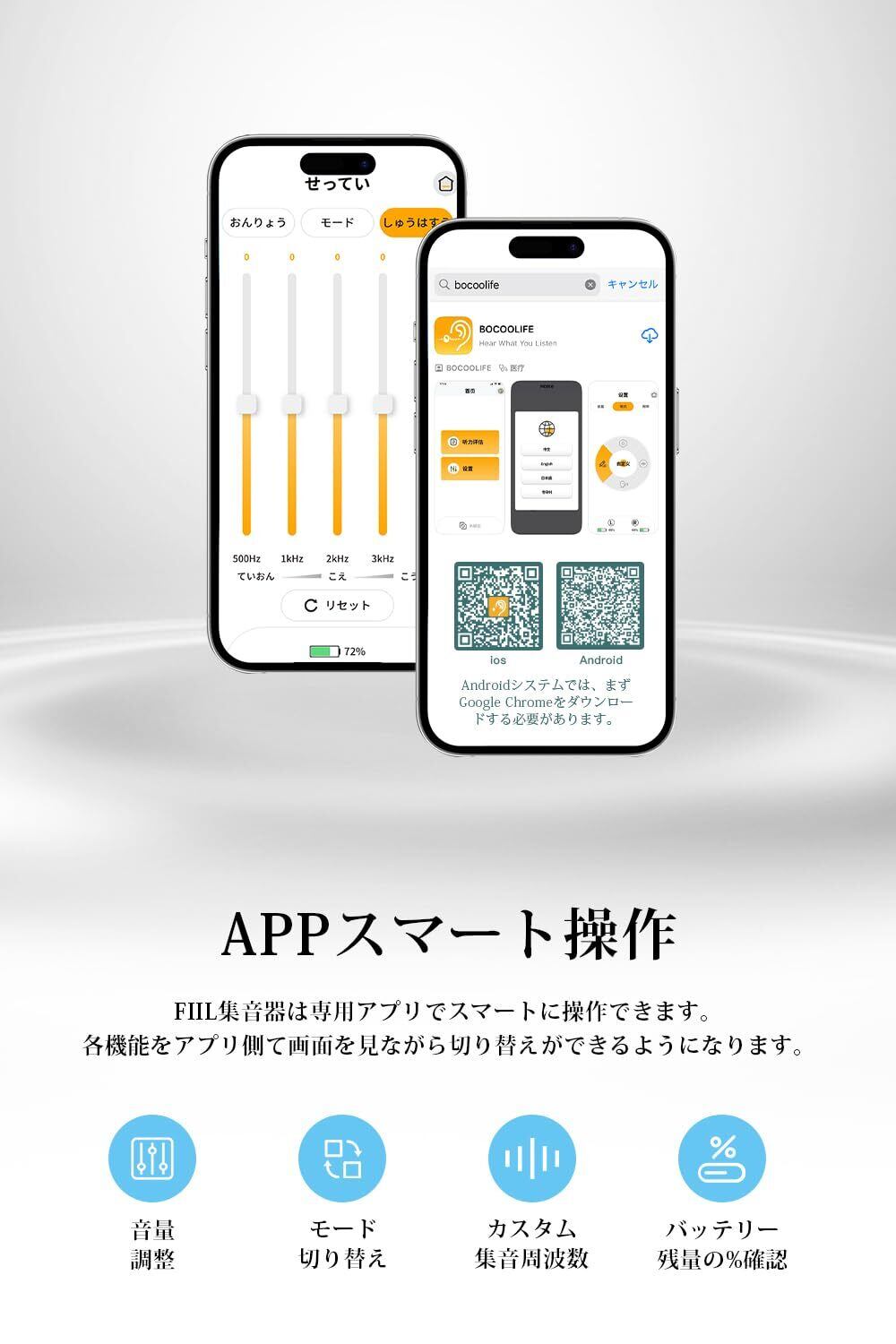 【APPスマート操作・カスタム設定】FIIL集音器は、専用アプリで音量調整やモード切替、カスタム設定が可能です。カスタムモードでは、お好みに合わせて集音周波数を調整可能。設定した周波数は自動で保存され、次回同じモードを起動すると、前回の設定がデフォルトで適用されます。