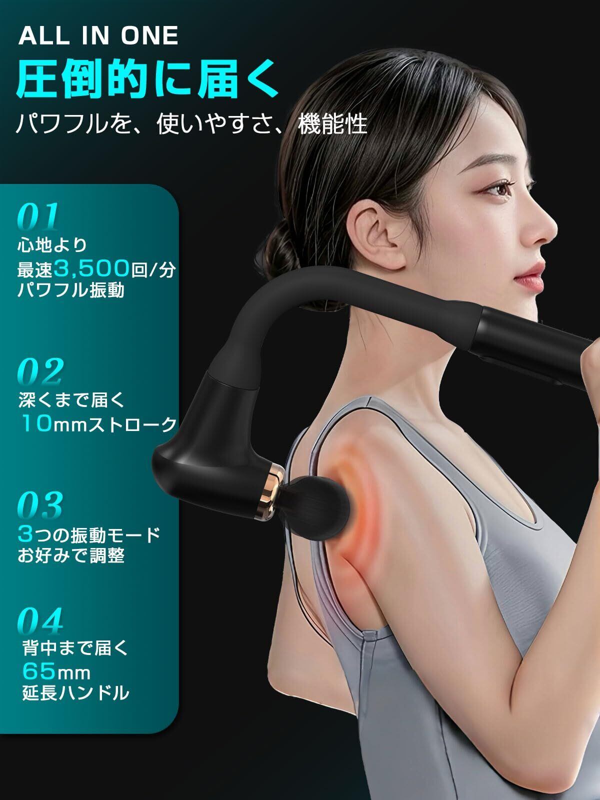 【1台で全身ケア、背中にも届く・弾力性アーム実用性】の筋膜リリースガンは、設計を採用し、従来の製品に比べてさらに使いやすく進化しています。本体部分は適切に延長され、流線型のアーチを採用することで、使い心地がより柔らかく、手触りも優れています。伸縮性があり、異なる体格や年齢層の方々にも最適なフィット感を提供します。延長ハンドルは人間工学に基づいた設計が施されており、手にしっかりとフィットし、長時間使用しても疲れにくく、力を節約できます。このデザインにより、脚をケアする際には腰を曲げることなく、自然な姿勢で効率的に使用できます。背中をリフレッシュする際には、無理に手を伸ばすことなく、簡単に手が届き、死角も避けられるため、全身のどこでもリラックス効果を実感することができます。使い心地に配慮したデザインは、どの部位でも効率的に筋膜をリリースし、リラックスを促進。