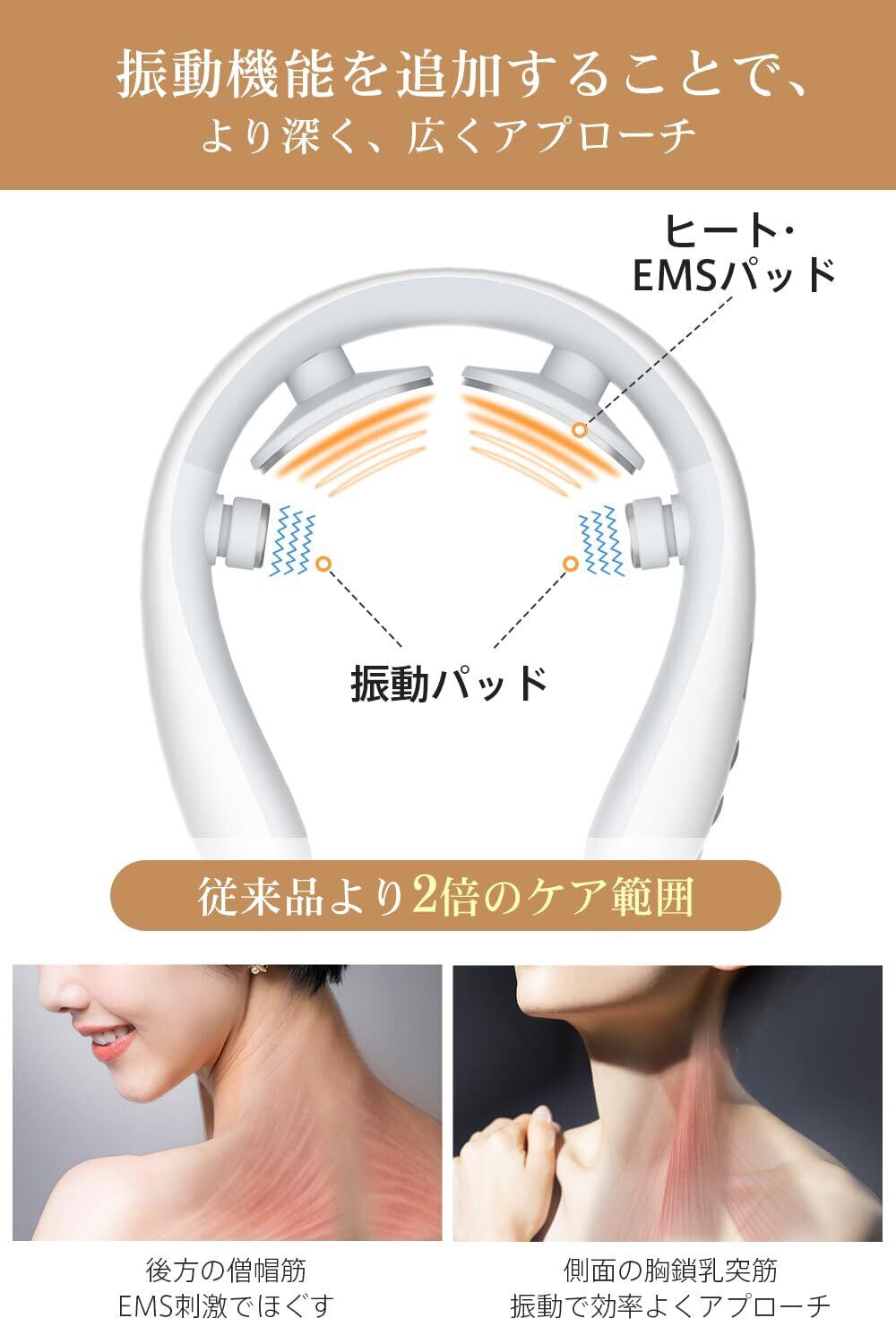 【振動機能を追加&新たなリラックス体験】「単純なEMS刺激」、[首後ろのみ]は物足りないなどのご意見をもとに、首後と側面両方を「EMS、振動、程よい温度」の三つ機能でケアしてくれる進化型の首リラクゼーション器を開発しました!!従来と違った革新デザインを採用、後方の2つEMS・ヒーターパッドに加え、側面に二つの振動パッドが配置されています。ほぼ同じ周波の振動とEMSで、効率よく「首後と側面」両方の筋肉に働きかけ、より広く深くケアしてくれます。