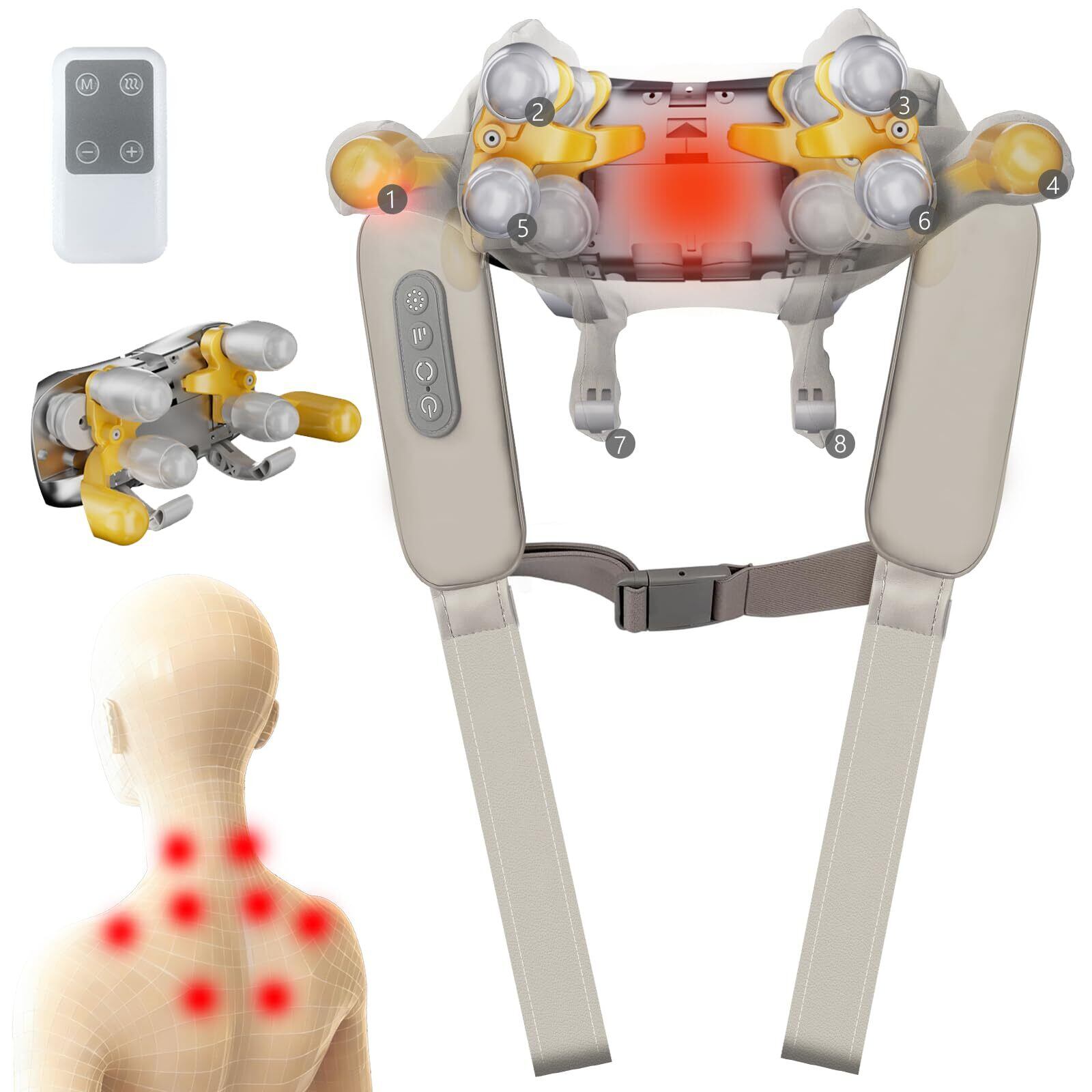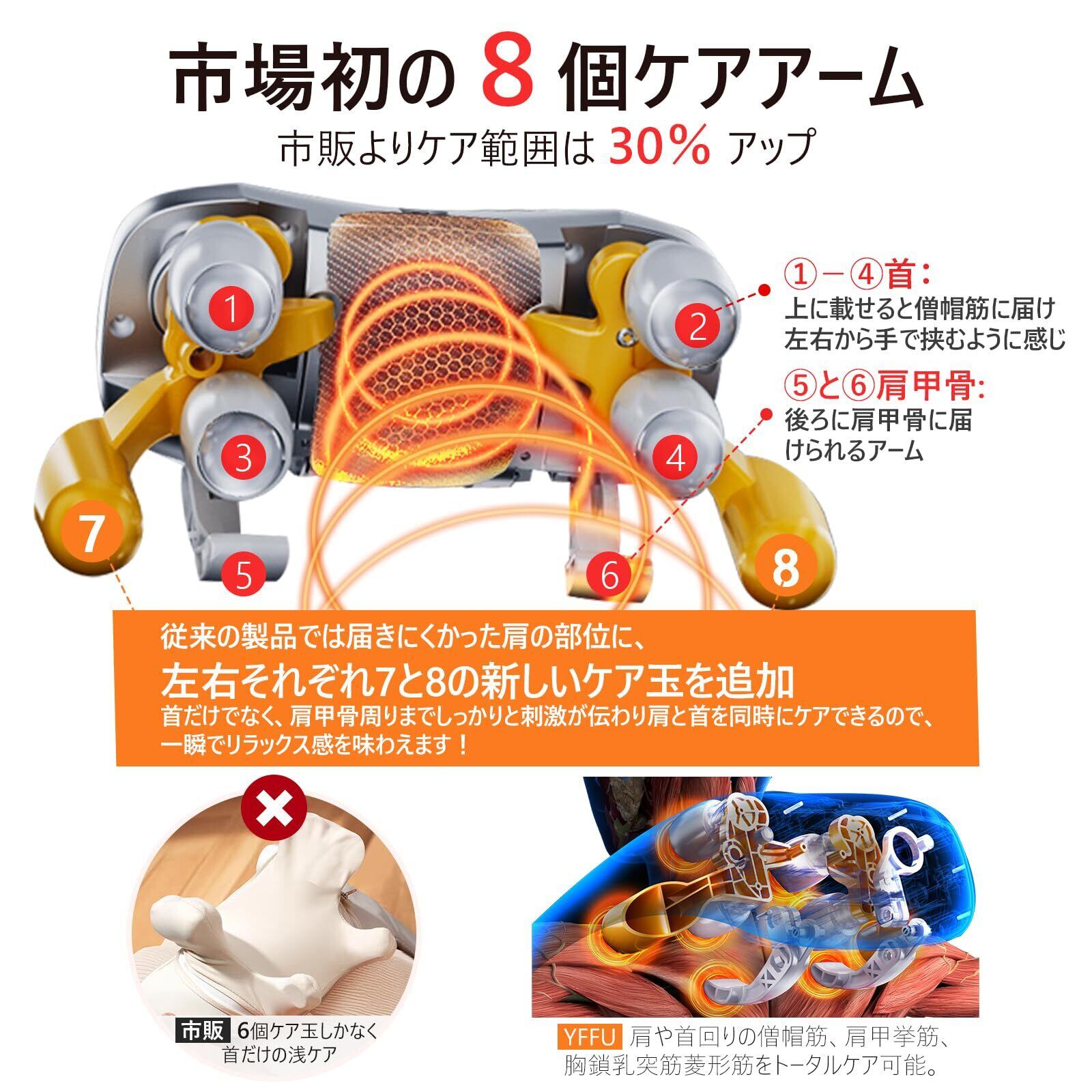 【8個広範囲をケア:2個ケアアーム・6個ケア玉】「もう少し強くのを欲しい」という声をヒントに市場より「ケアアーム」とケア玉を2個追加し合計8個ケアで、首まわりにぴったりフィットし、4D全方位ケアできるネックケア製品を開発しました。従来品は4個の肩のみのケアでしたが、このリラクゼーション器は後ろに独自設計の2個ケアアームがあるため、肩甲骨周りがぐりぐりリラックスできます。その上に、首回りの4個ケア玉以外に、肩周りにも2個ケア玉追加で、グイグイピンポイントに作動し、ちゃんと人の手のような肩をがしっと掴む自然使用感を実現できます。ケア玉の立体的な動きとアームの上下の動きが絡み合った多彩な技で、より多くのよりリアルなリラックス方法をシミュレーションできます。首、肩甲骨だけでなく、肩、背中、腰、足もトータルケアできます。