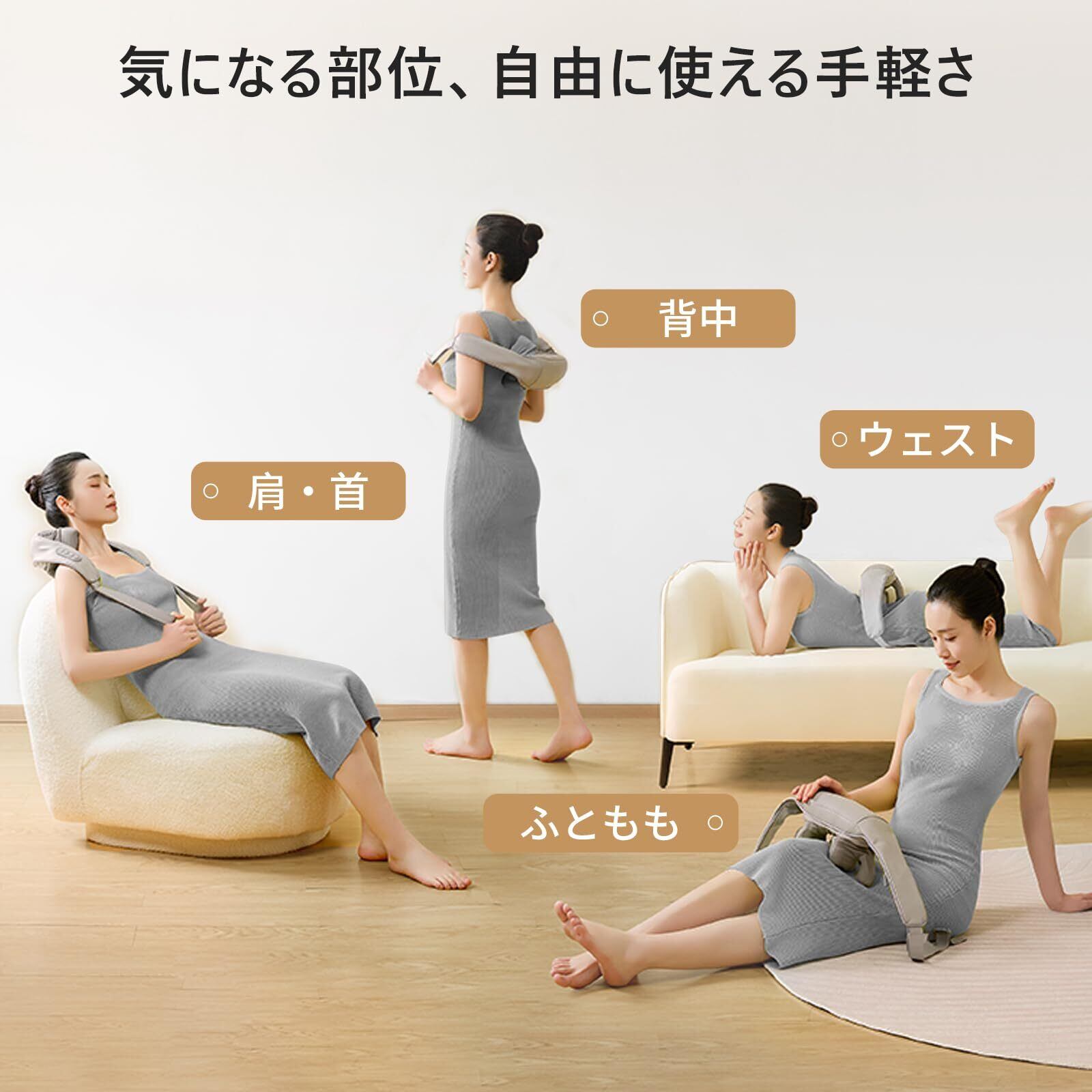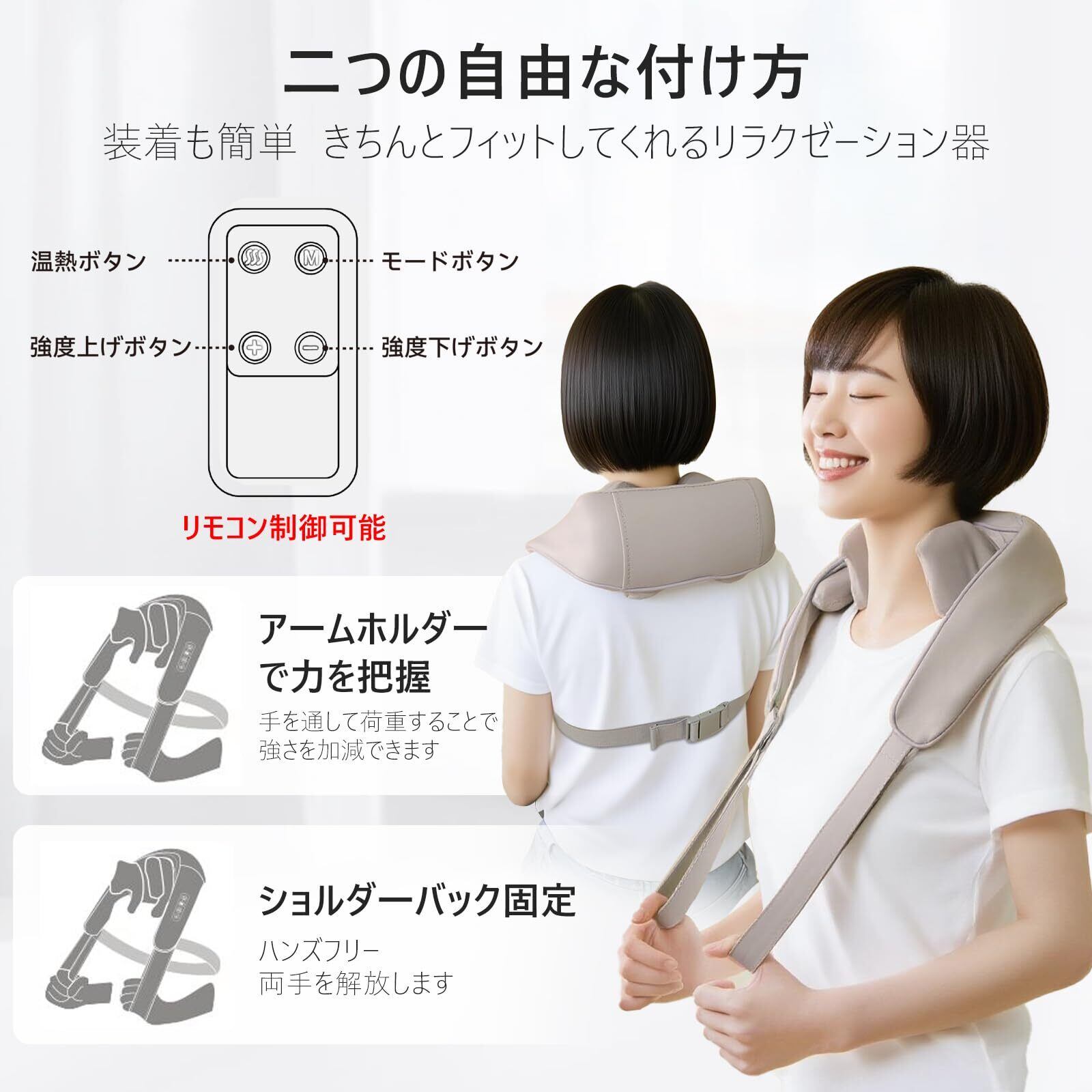 【大容量バッテリー・超静音】充電式コードレスでコンセントを繋げていなければ使用できないことはない。Type-C充電式設計でとても便利。バックルストラップのデザイン、背後にストラップをクリップで締めば、手でリラクゼーション器をずっと引っ張る必要がなく、仕事をしながら、テレビを見ながら、ソファに横になりながらで肩や首のケアができます。2500mAhの大容量バッテリーを搭載し、1回の充電で作動2時間の連続作動が可能。作動音はとてもサイレントで仕事の合間に、出張先でどこでも使っても便利。注:※初回はフル充電してから使ってください。フル充電になると充電ランプはグリーンになります。※長時間使用しない場合は、使用前にフル充電してください。パッケージ内容:本体×1、リモコン×1、USBケーブル×1、日本語取扱説明書×1 。ご購入日より❷年間のがあります。ご購入後、何かご不明な点がございましたら、お気軽にお問い合わせください。連絡方法:「注文履歴」ー「該当商品」ー「出品者に連絡」。