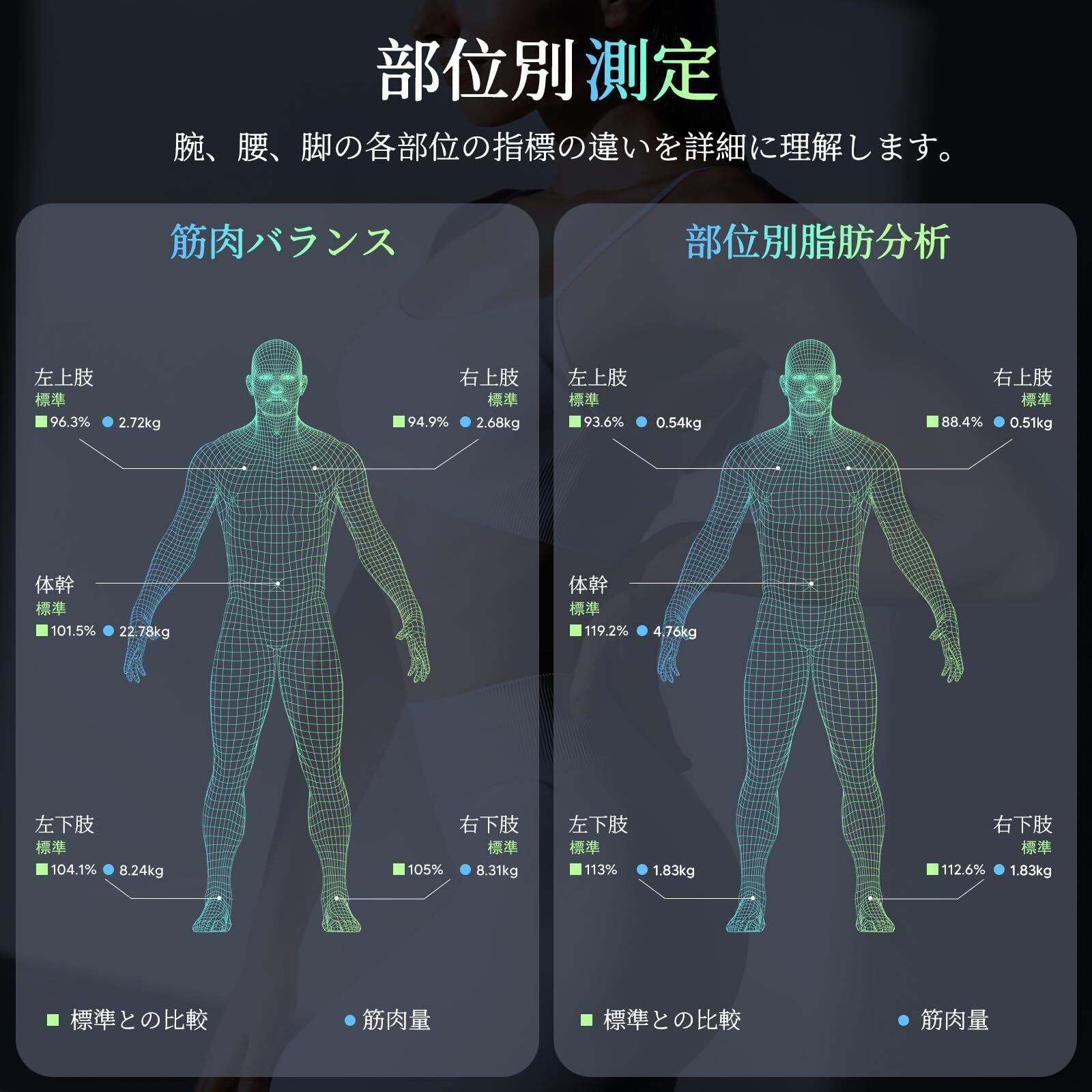 「50項目の体組成分析」この体重計は高度な精度を誇るセンサーを搭載し、体重、BMI、体脂肪率、除脂肪体重、皮下脂肪、内臓脂肪、水分量、筋肉量、骨量、タンパク質、基礎代謝率、体年齢など、合計26項目にわたる重要な体組成データを精密に測定します。Arboleafのスマート体重計は、これらのデータに基づいた詳細な健康分析と、個別に最適化されたフィットネスプランを提供し、体重管理に理想的です。