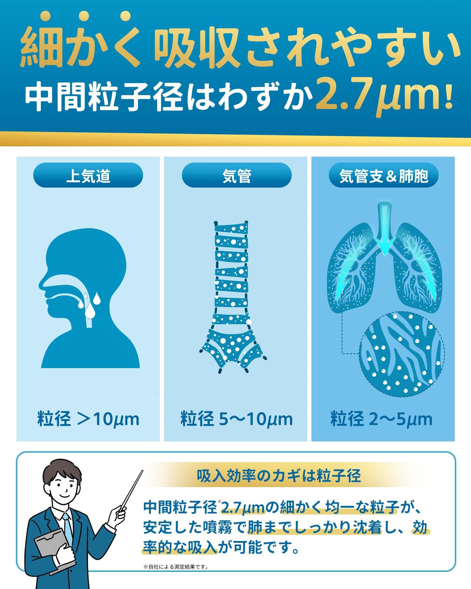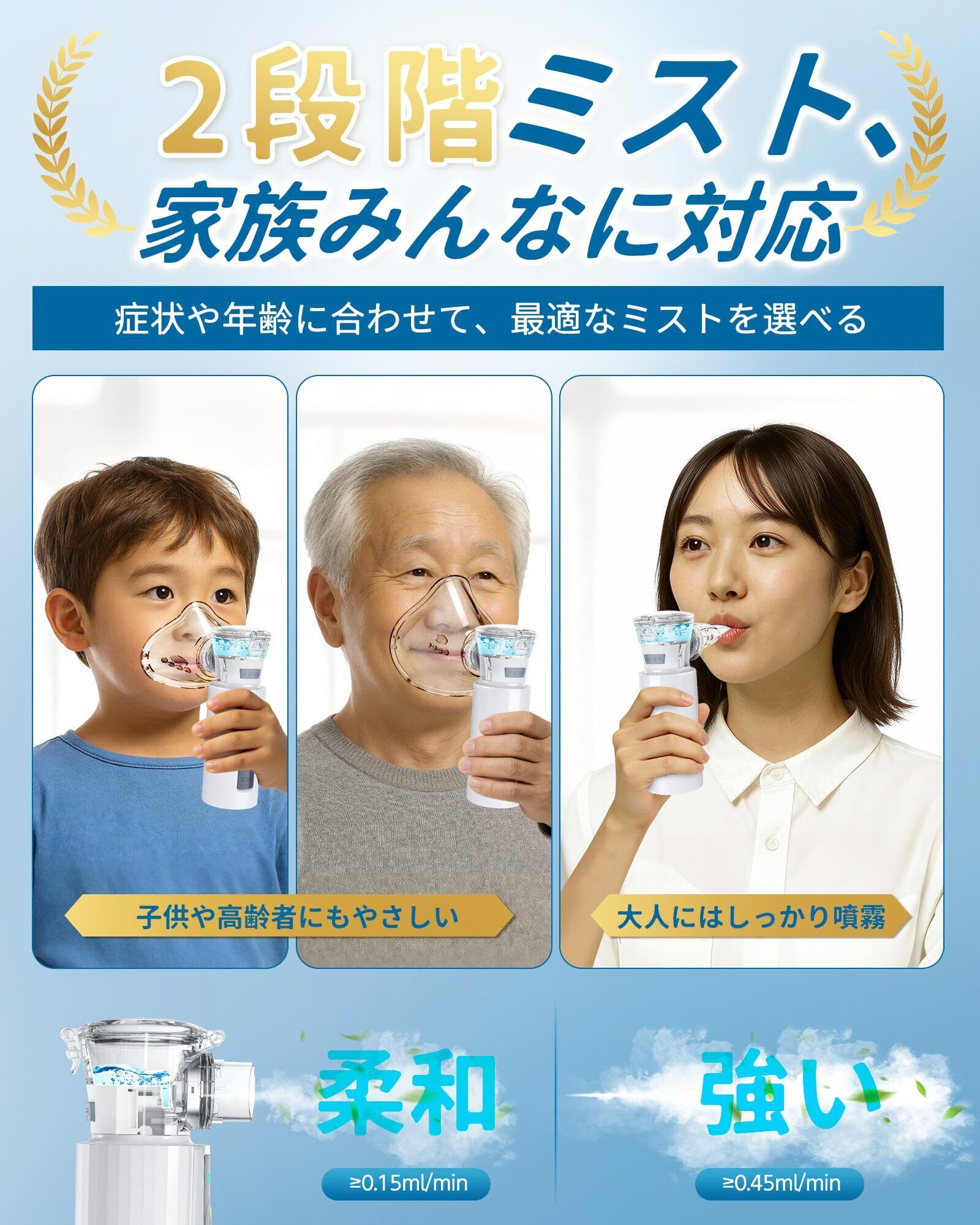 【微細ミスト&高効率吸入】Hygelinkネブライザーは中間粒子径約2.7μmの超微細ミストを生成。上気道をスムーズに通過し、気管支から肺胞まで深く届き、下気道における沈着を促し効率的な吸入をサポートします。1200孔の精密メッシュを採用し、従来比50%増の孔数で、薬液をより均一かつ微細な粒子として気道へ届けます。また、強・弱2つのモードを搭載。弱モード(≥0.15ml/min)は穏やかな噴霧量で、お子様やご高齢の方に適しています。強モード(≥0.45ml/min)は噴霧量を高め吸入時間を短縮し、成人の効率的なニーズに対応。家族一人ひとりのニーズに寄り添い、効率的で質の高い霧化体験を提供します。