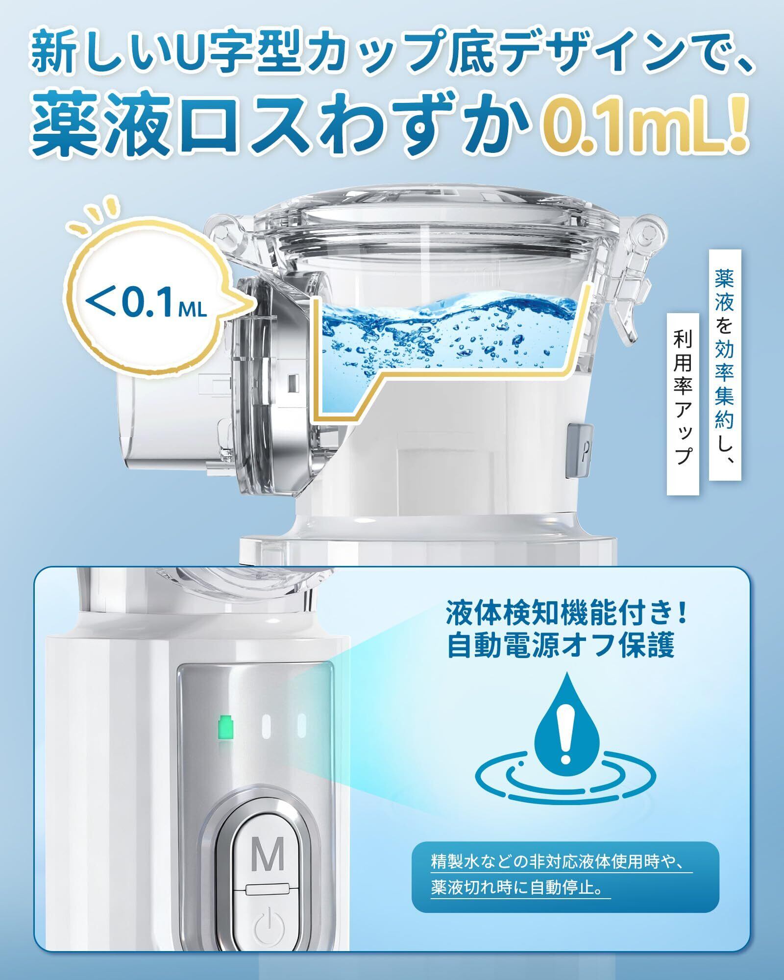 【自動洗浄機能&液体検知機能】自動洗浄機能を搭載し、薬液の残留を取り除きます。モードボタンを5秒間長押しするだけでメッシュプレートを洗浄でき、安定した霧化性能を維持。薬液カップにはU字型底面構造を採用し、薬液を噴霧口へ集めることで残液量を約0.1ml以下に抑制、薬液の利用効率を高めます。さらに、液体検知機能により、非対応の液体(精製水など)の使用時や薬液が切れた際に自動で停止。手動の設定が不要なだけでなく、メッシュプレートの空運転による損傷を防ぎ、製品寿命を延ばします。お手入れの負担を軽減する設計により、長期間にわたって清潔かつ安定した状態を保ち、毎日の霧化をよりスムーズにサポートします。
