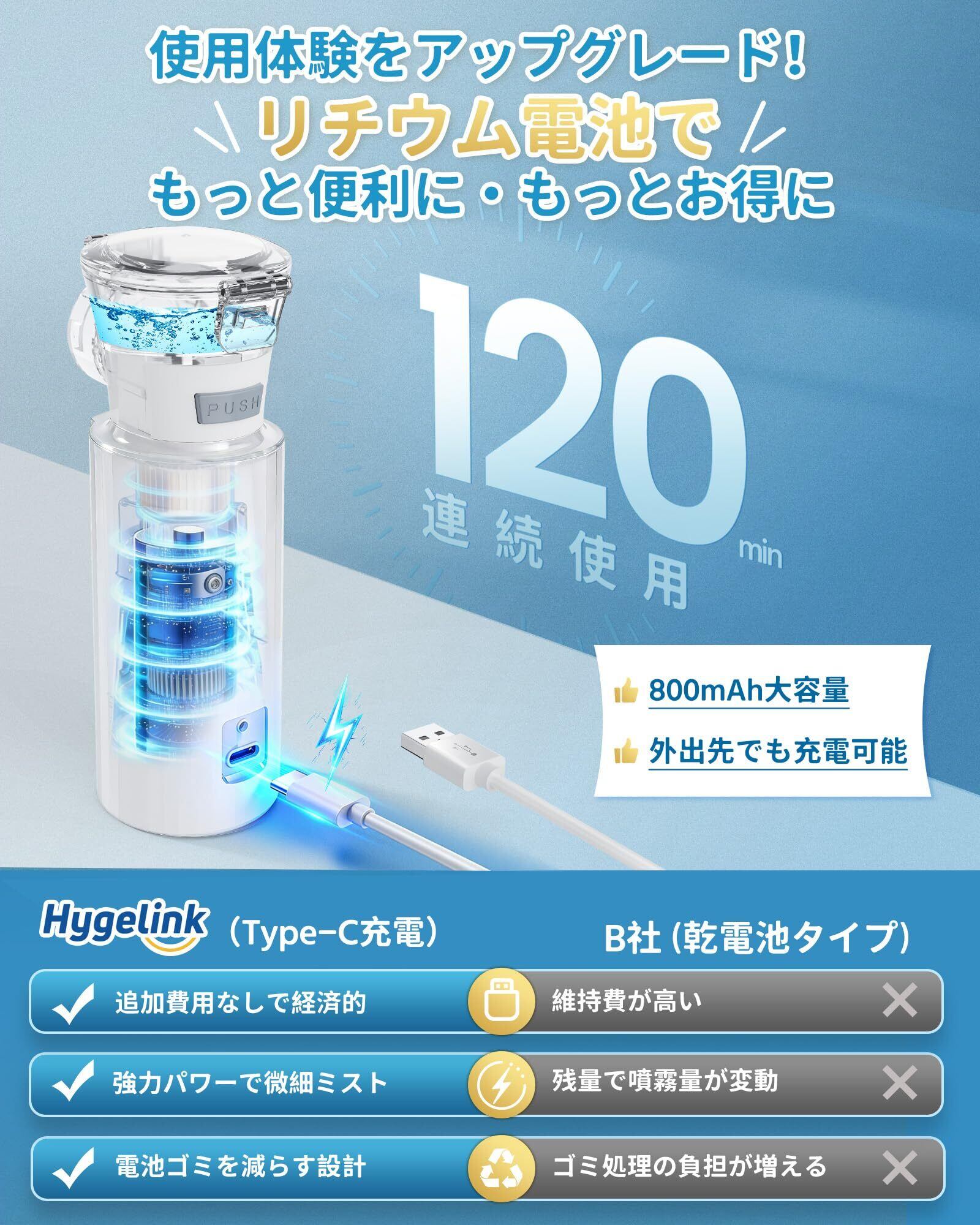 Hygelink ネブライザー 吸入器 薬液吸入用 Type-C充電式 超音波メッシュ式 吸入器 パワフル噴霧 2段階モード 2時間長時間運転 静音 軽量 自動洗浄機能 無水検知機能 携帯便利 マスク(子供用/大人用)とマウスピース付き 家庭全員適用 収納袋付き 日本語説明書 自宅・学校・旅行先にも最適 プレゼント