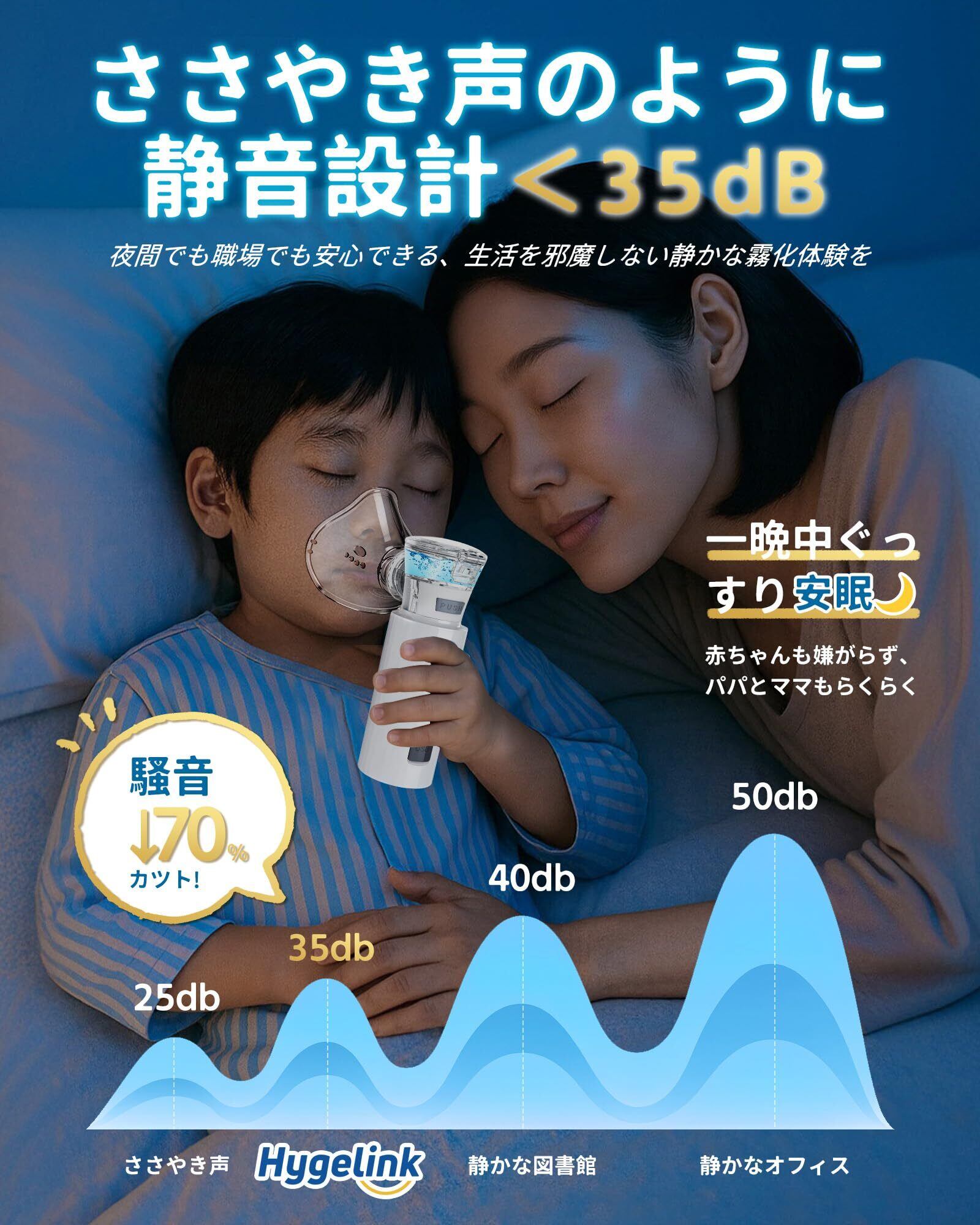 【静音設計&簡単操作】Hygelinkネブライザー 吸入器は、ささやき声のように静かな静音設計(<35dB)を採用。音を嫌がるお子様でも受け入れやすく、深い眠りを妨げることなく吸入を行えます。深夜の使用でもご家族に気兼ねする必要はありません。複雑な手順を省いた直感的な2ボタン設計により、ご高齢の方やお子様も簡単に操作いただけます。柔らかなインジケーターライトを搭載し、暗い場所でも霧化の状態やデバイスのステータスを的确に判断でき、操作ミスを防ぎます。就寝前のナイトケアからオフィスでの使用まで、日常生活のあらゆるシーンに静かに馴染みます。時間や場所を選ばず、快適な静音環境での吸入体験を提供します。