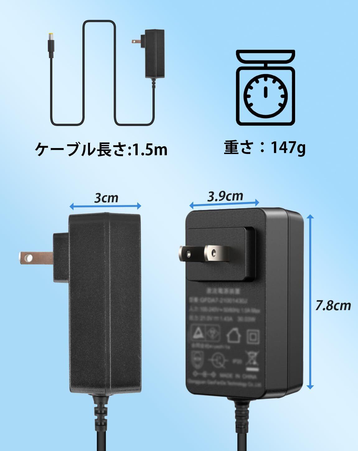 【空調作業服 21V 充電器のパラメータ】当社の空調ベストバッテリー AC充電アダプターは、入力/INPUT: 100-240V~50/60Hz 1A Max、出力/OUTPUT: 21V-1.43A、ケーブル長さ:1.5m、フル充電時間:5000mAhのバッテリーを使用した場合、充電時間は約3.5〜4時間です。