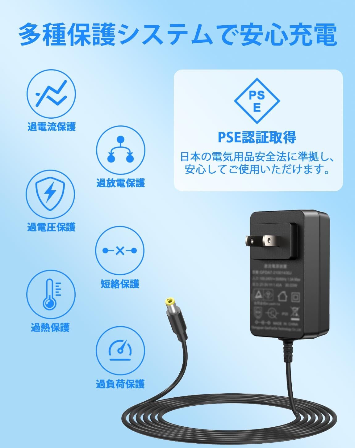 【21V空調服充電器 多重保護設計で安心】本バッテリー 対応ACアダプターは、特定電気用品安全法に基づく技術基準に適合した「菱形PSE」マークを取得しています。さらに、過電圧保護・過電流保護・過熱保護・短絡保護・過放電保護・過負荷保護など、複数の安全保護機能を備えており、安心してご使用いただけます。
