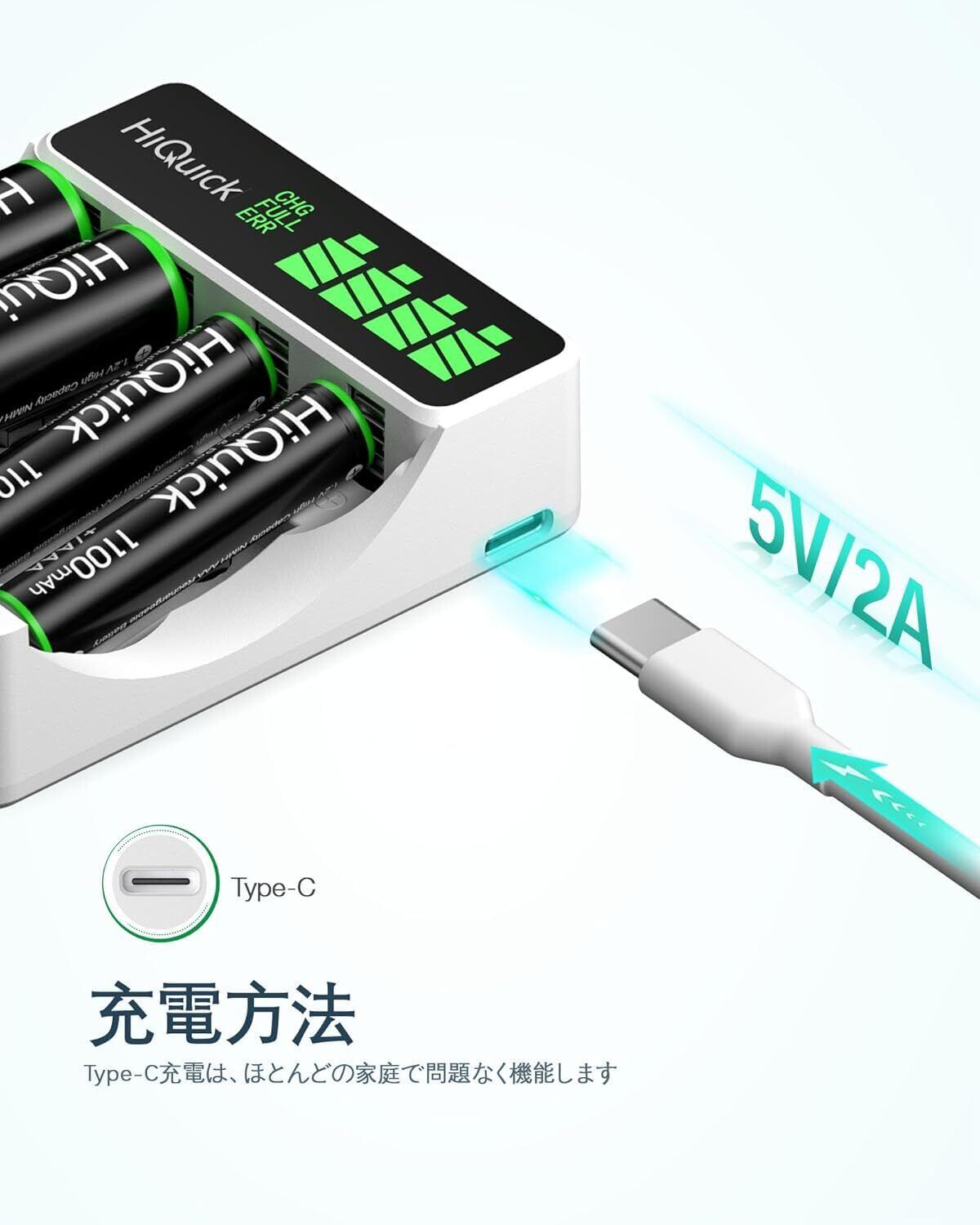 【充電池充電器セット】仕様:充電池 単3 単4 充電器セット 充電器入力:Type-C 出力:DC1.2V 単三 1800mA 単四 900mA 充電池:単3 ニッケル水素 容量:2800mAh*4本入り;単4 ニッケル水素 容量:1100mAh*4本入り 附属品:日本語説明書、USBケーブル