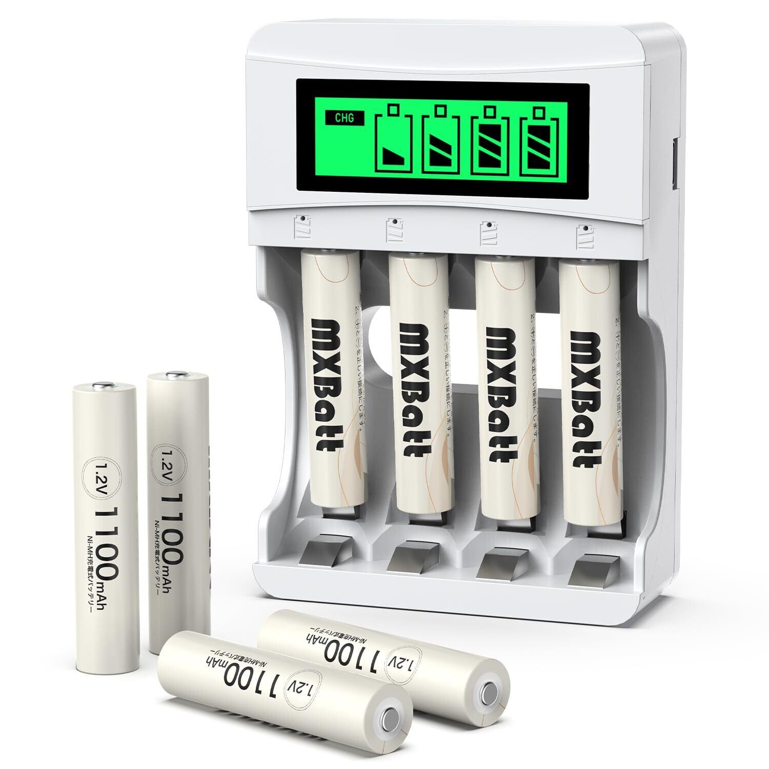 【仕様】商品内容:単4充電池8個パック、LED充電器* 1、充電ケーブル*1、充電器取扱説明書*1。 電池電圧:1.2V。電池容量:1100mAh。タイプ:ニッケル水素電池 。