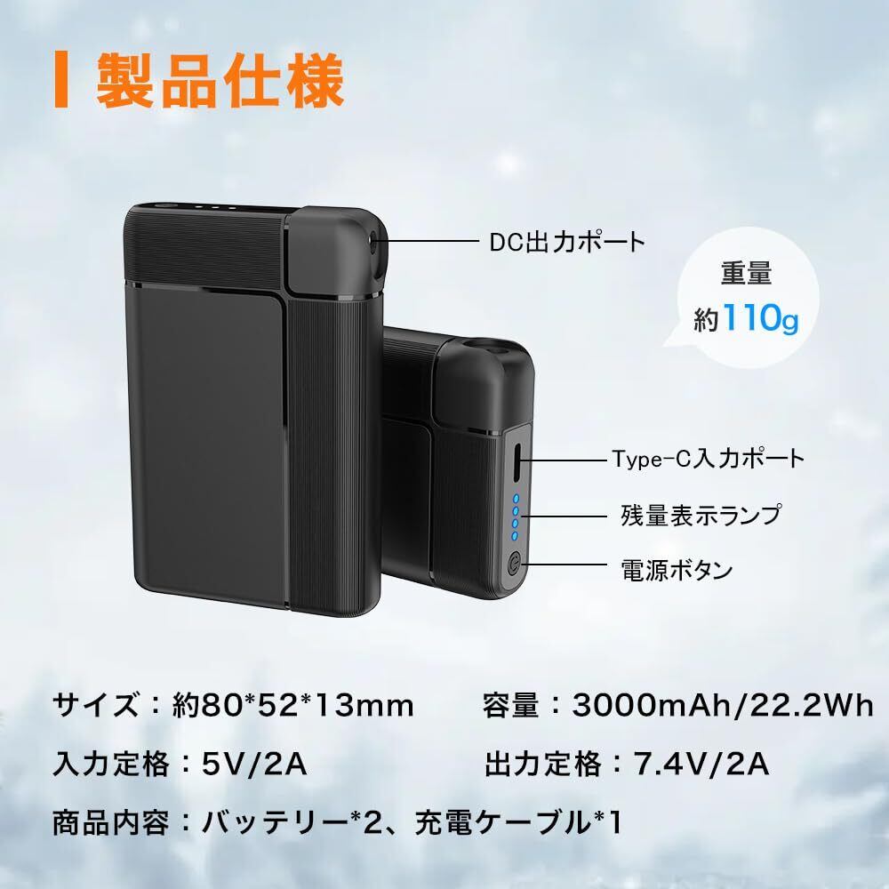 【長時間加熱】本7.4Vバッテリーは3000mAhの大容量を提供し、電熱製品に長期的なエネルギーを提供し、寒い天候でも頻繁に充電することが必要ありません。軽量設計で持ち運びが簡単で、充電式なのでバッテリーを複数回使用できるため、便利であるだけでなく、環境に優しく、コストも節約できます。